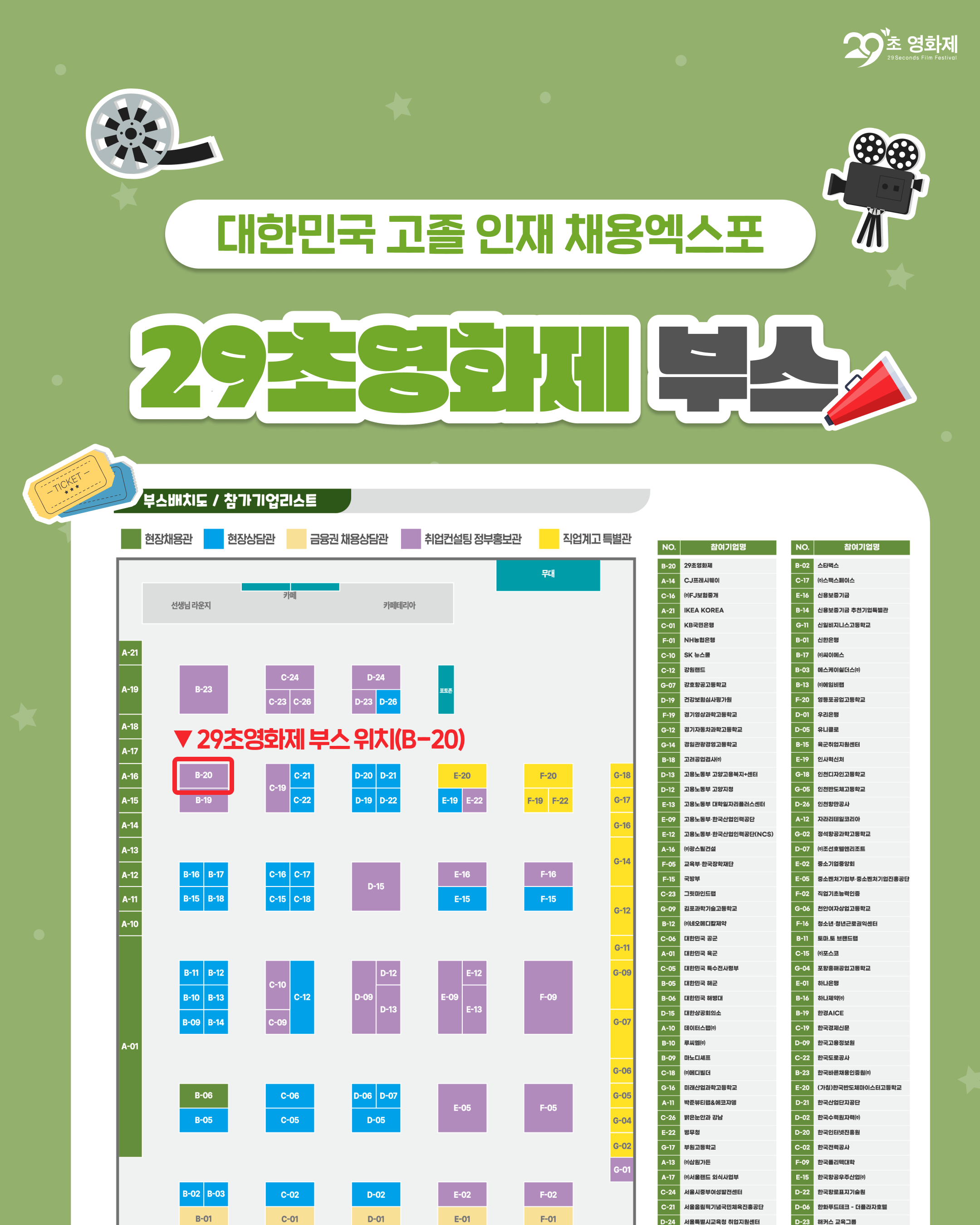 29초영화제 부스 위치는 위 약도를 참고해보시면 좋을 것 같아요. 이외에도 다양한 부스들이 있으니 함께 둘러보시면 더욱 알찬 행사가 될 것 같습니다. 추가적으로 영상 교육을 고민하고 계신 선생님들에게 맞춤으로 진행하는 ‘영상 꿈나무 양성 프로젝트’ 컨설팅도 있다고 하니 참고해주세요.