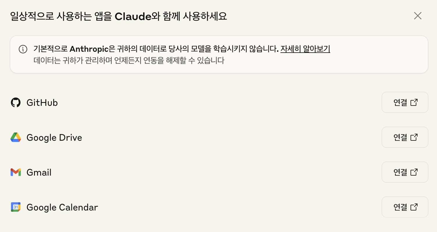 클로드에서 새로운 채팅창 아래쪽에 있는 [앱 연결] 버튼을 클릭해보면 깃허브와 구글 드라이브, 지메일과 구글 캘린더를 연결할 수 있는 기능을 제공하고 있다. 나는 개인적으로는 구글 캘린더와 지메일, 구글 드라이브를 사용하는 입장이지만, 굳이 클로드에 연동해가면서까지 활용해야할 필요성은 느끼지 못하고 있다. 하지만 관련 서비스들을 해비하게 사용하는 사용자라면 연동해서 사용해볼 가능성이 충분하다.