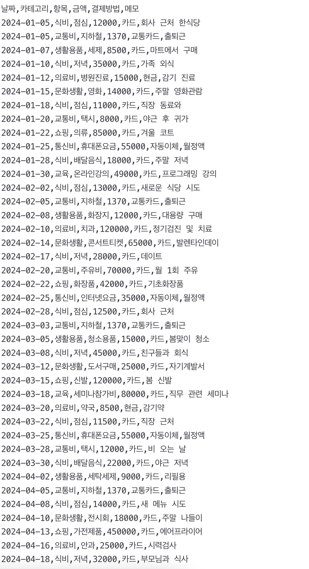 데이터 시각화 관점도 알아보자. 내가 가지고 있는 CSV 파일 등을 활용해 다양한 월별 지출을 비교하는 차트를 만드는 것도 가능하다. 월별 지출 항목이 있는 CSV 파일이 필요할텐데, 만약 없다면 샘플 CSV파일 요청을 먼저한 후 해당 파일로 월별 지출을 비교하는 차트를 만들면 된다.