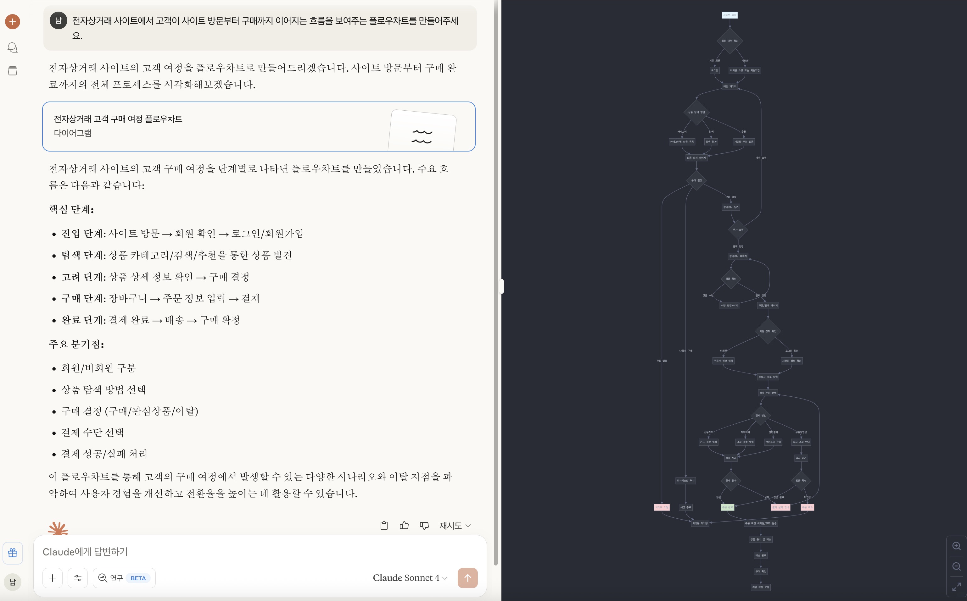 오른쪽 화면처럼 다이어그램이 아티팩트로 만들어진다. 해당 플로우차트는 클로드에서는 다이어그램 및 차팅 툴인 mermaid 형식으로 제작된다. 다운로드할 경우 .mermaid 파일이 다운로드된다. 코드로도 볼 수 있다.