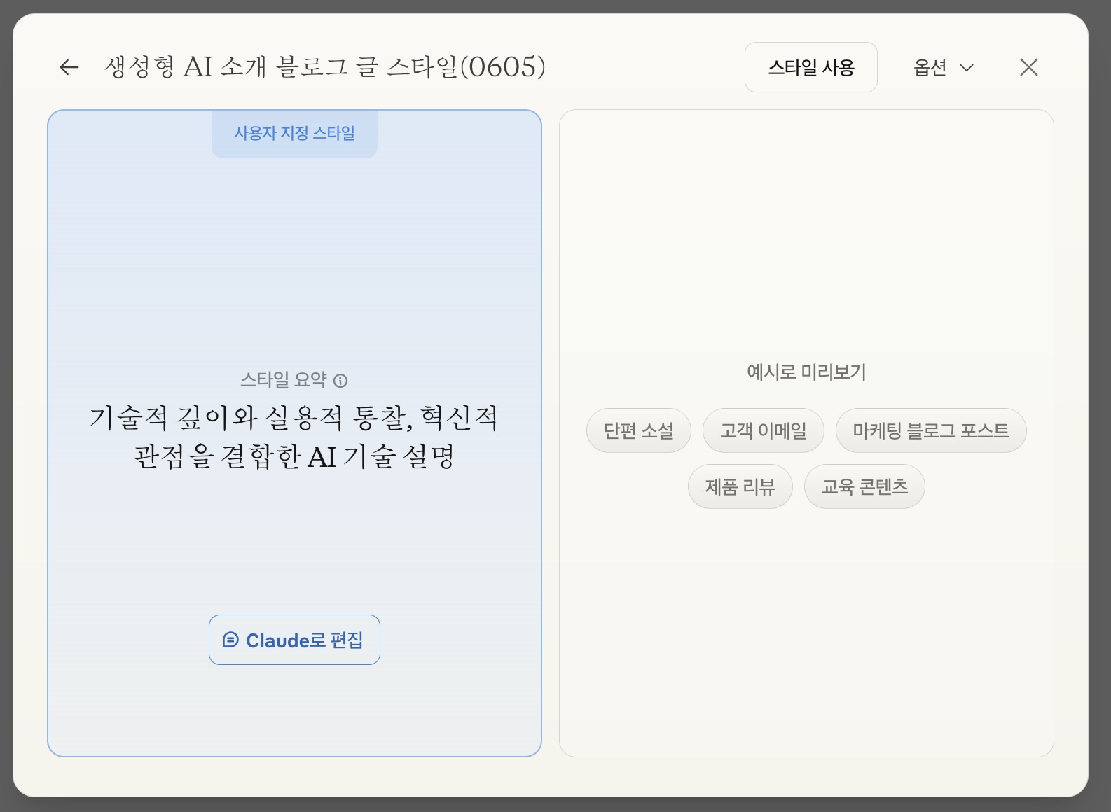 기존에 직접 작성했던 블로그 글 전체를 복사 붙여넣기해서 새로운 스타일을 만들고 제목 구분을 위해 수정해주었다. 이제 이렇게 스타일을 만든 다음 프롬프트를 작성해보자. 스타일 설명에 보면 기술적 깊이와 실용적인 통찰, 혁신적 관점을 결합한 AI 기술 설명으로 요약되었다. 앞으로 이 스타일 사용은 해당 요약본에서 설명하는 스타일로 결과물이 만들어질 것이다.