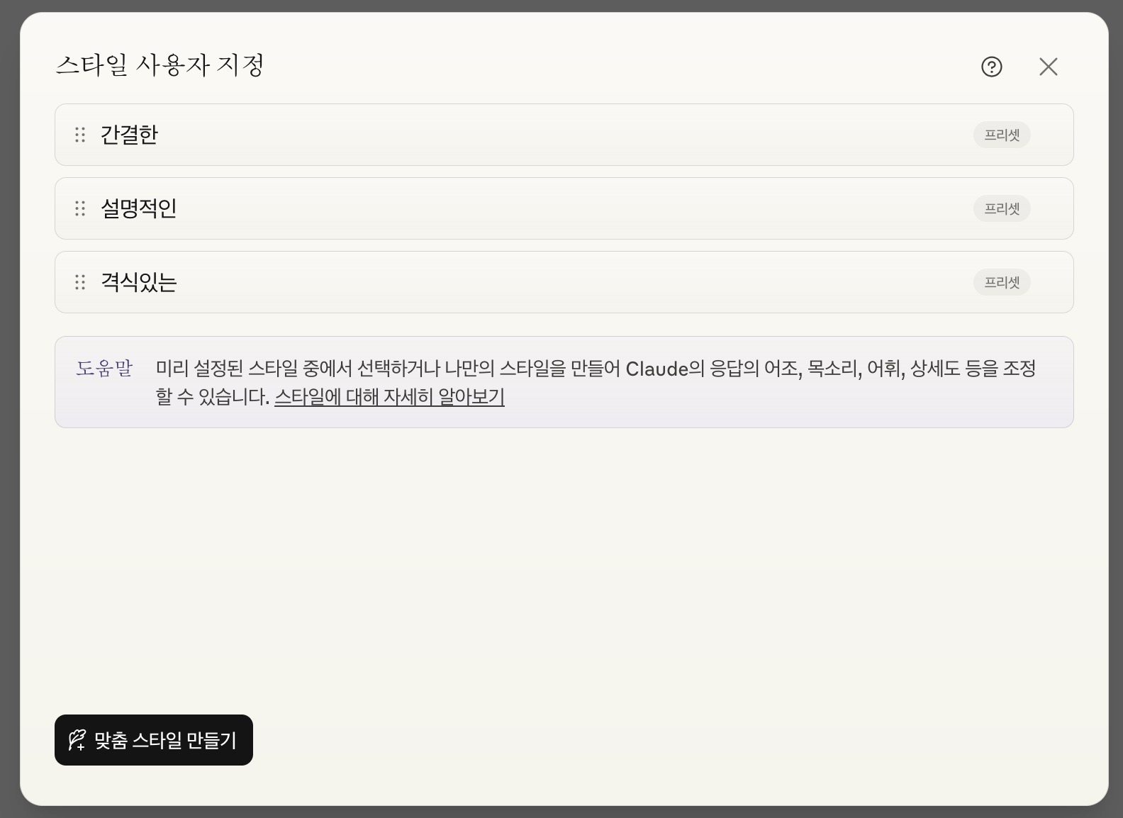 클로드라고 하는 AI에서는 스타일을 미리 설정해두는 기능이 있다. 클로드에서 말하는 스타일은 한국어로 굳이 바꾸자면 '형식' 정도가 될 것 같다. 사용자는 미리 스타일을 설정해두거나 미리 설정된 스타일 중 하나를 선택할 수 있다. 기존 스타일보다는 자신만의 스타일을 만들어서 사용하는게 좀 더 적절한 방법으로 보인다. 자신만의 스타일을 만들어두면 클로드에서 결과물이 나올 때 어조, 어휘, 상세도 등을 조정할 수 있다.