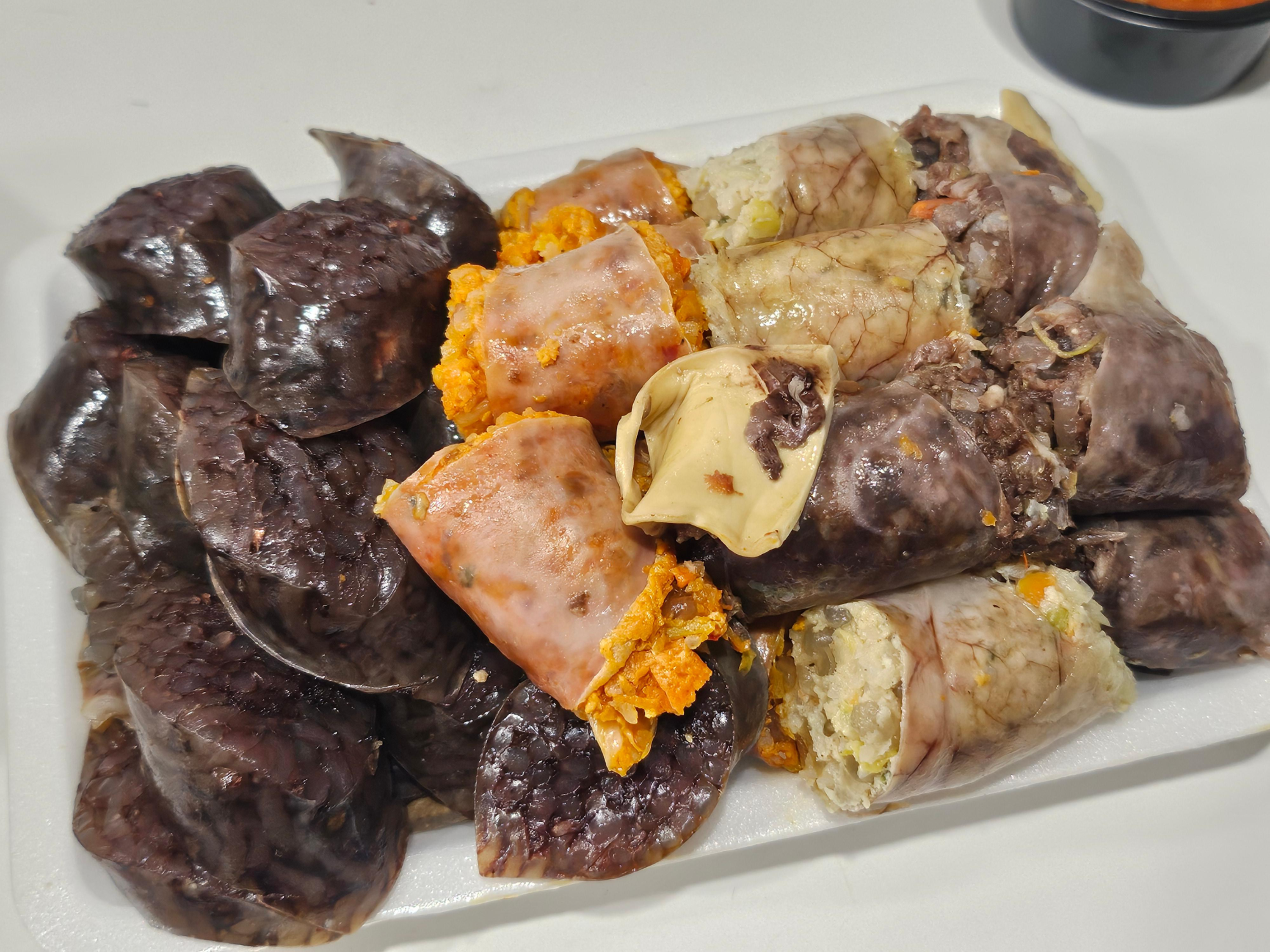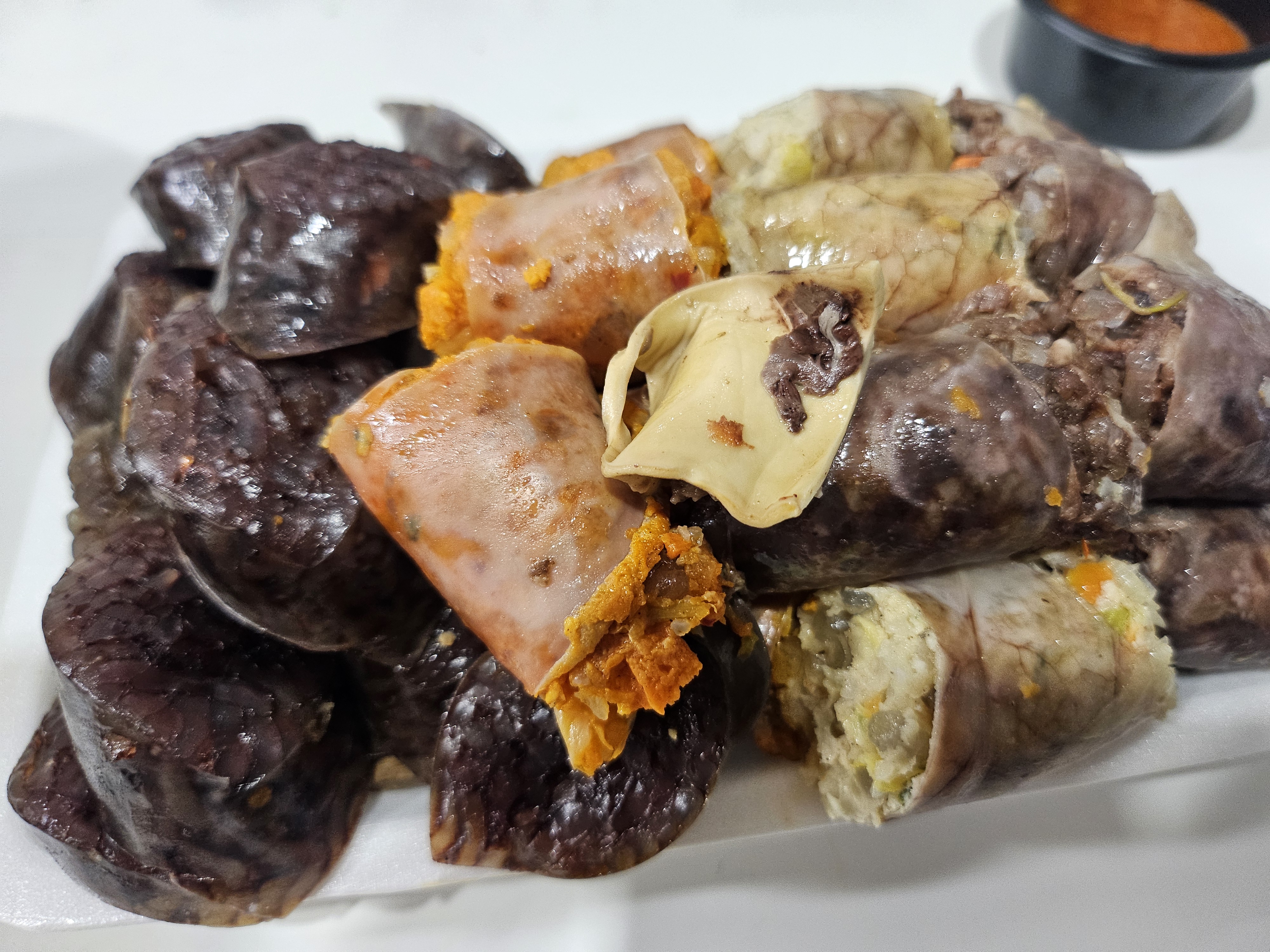 이것저것 푸짐하게 담겨있고 순대 종류도 여러가지이다. 내장이랑 간도 소수 들어있다. 나는 어릴때에는 순대먹을 때 내장 자주 먹었었다가 성인 되고부터는 내장을 잘 안먹게 되었는데... 비교적 최근부터는 다시 내장을 먹어보려고 하고 있다. 맛도 맛인데 내장 자체가 영양소나 건강에 꽤 괜찮은걸로 알고 있어서 먹어보고 있는데 먹다보니 의외로 나름대로 매력이 있는 부위다...ㅋㅋ