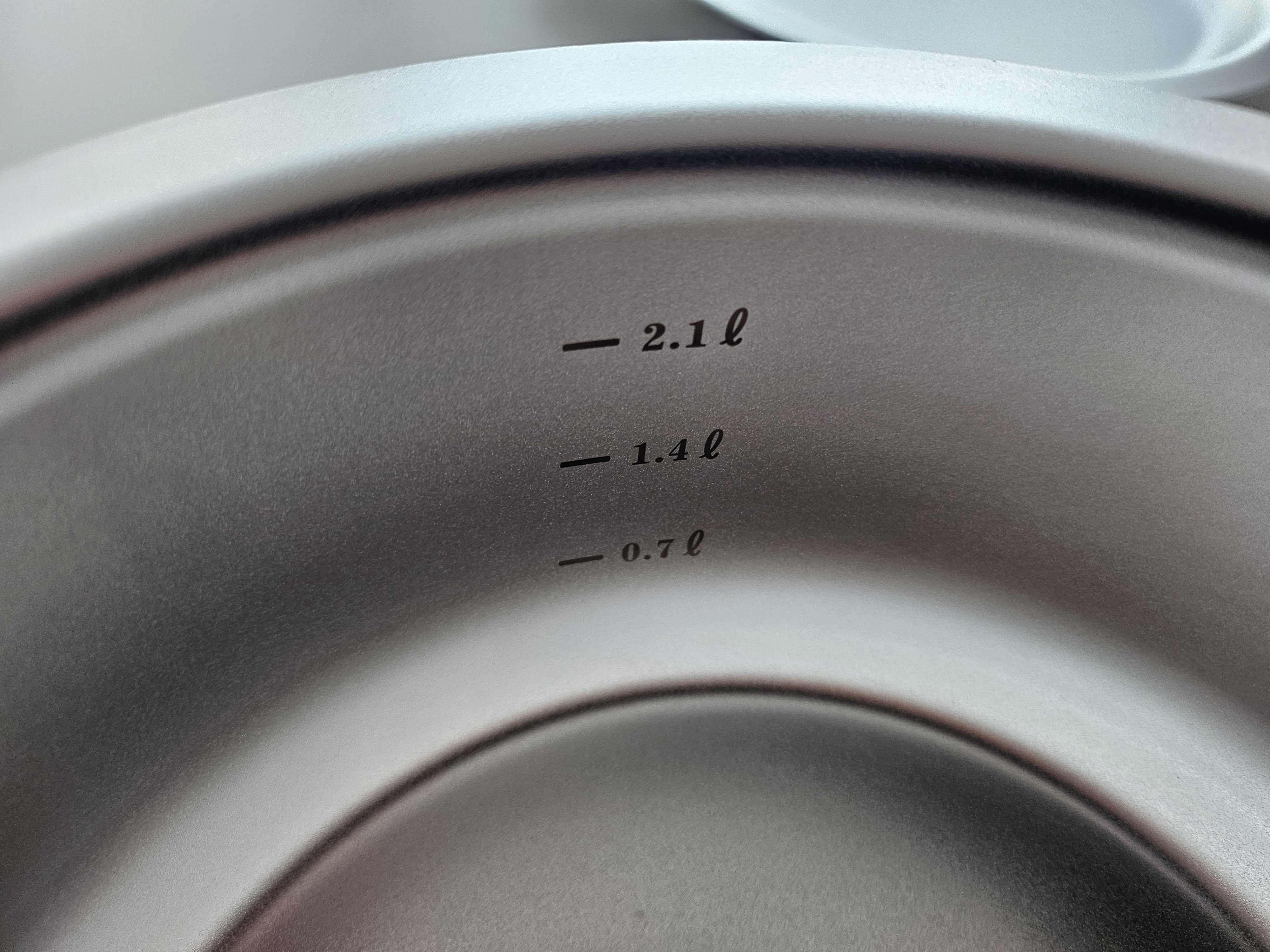 안쪽에는 리터 표시 단위가 3개가 있어서 필요하다면 참고할 수 있겠다. 무엇보다 무연마제 통주물이라는게 굉장히 매력적이다. 냄비 안쪽에 그 어떠한 나사구멍이나 홀 같은게 없기 때문에 음식물 처리나 설거지가 아주 쉬울걸로 생각된다.