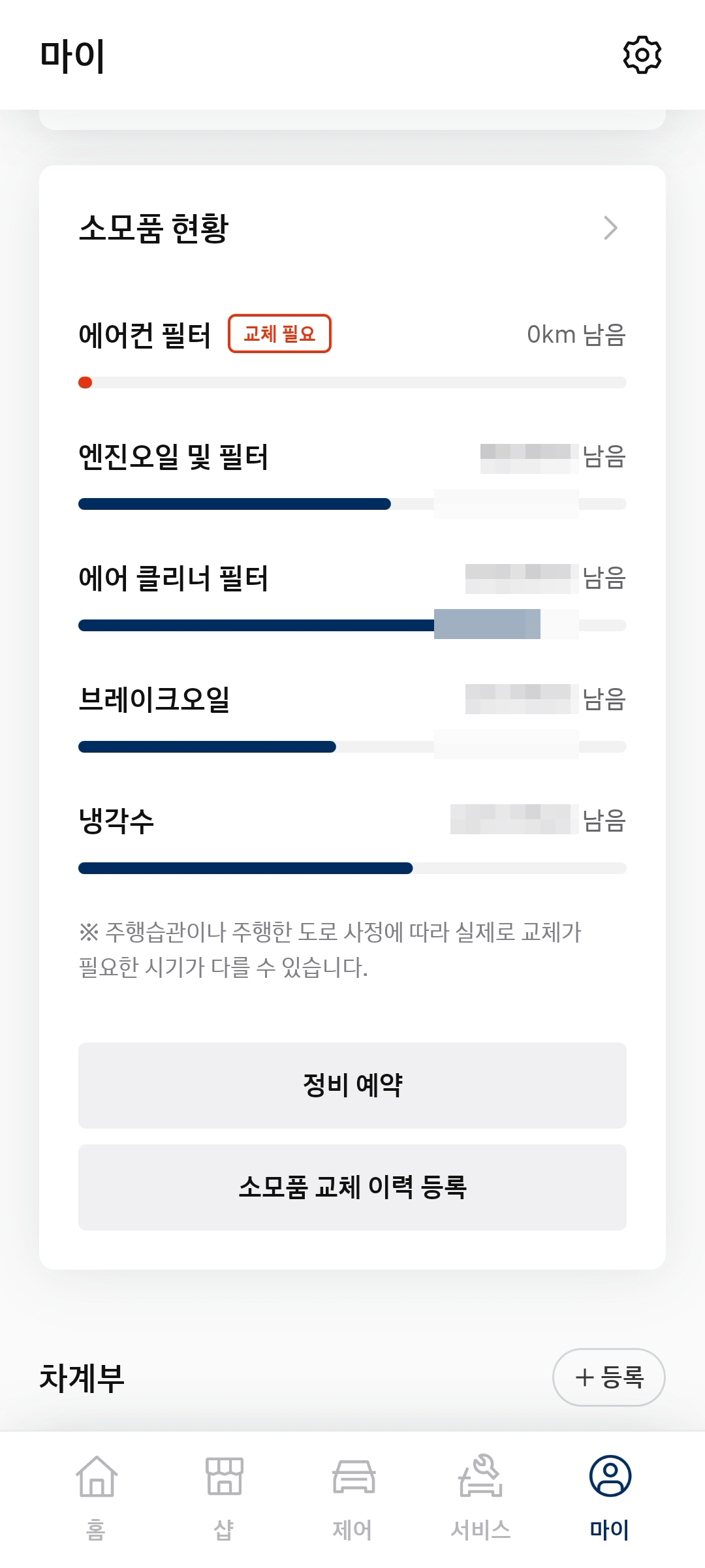 소모품 관련된 날짜를 확인하는 것도 있고 관리내용과 나의 소모품 및 관리 퍼센트를 보는 기능도 재미있었다.