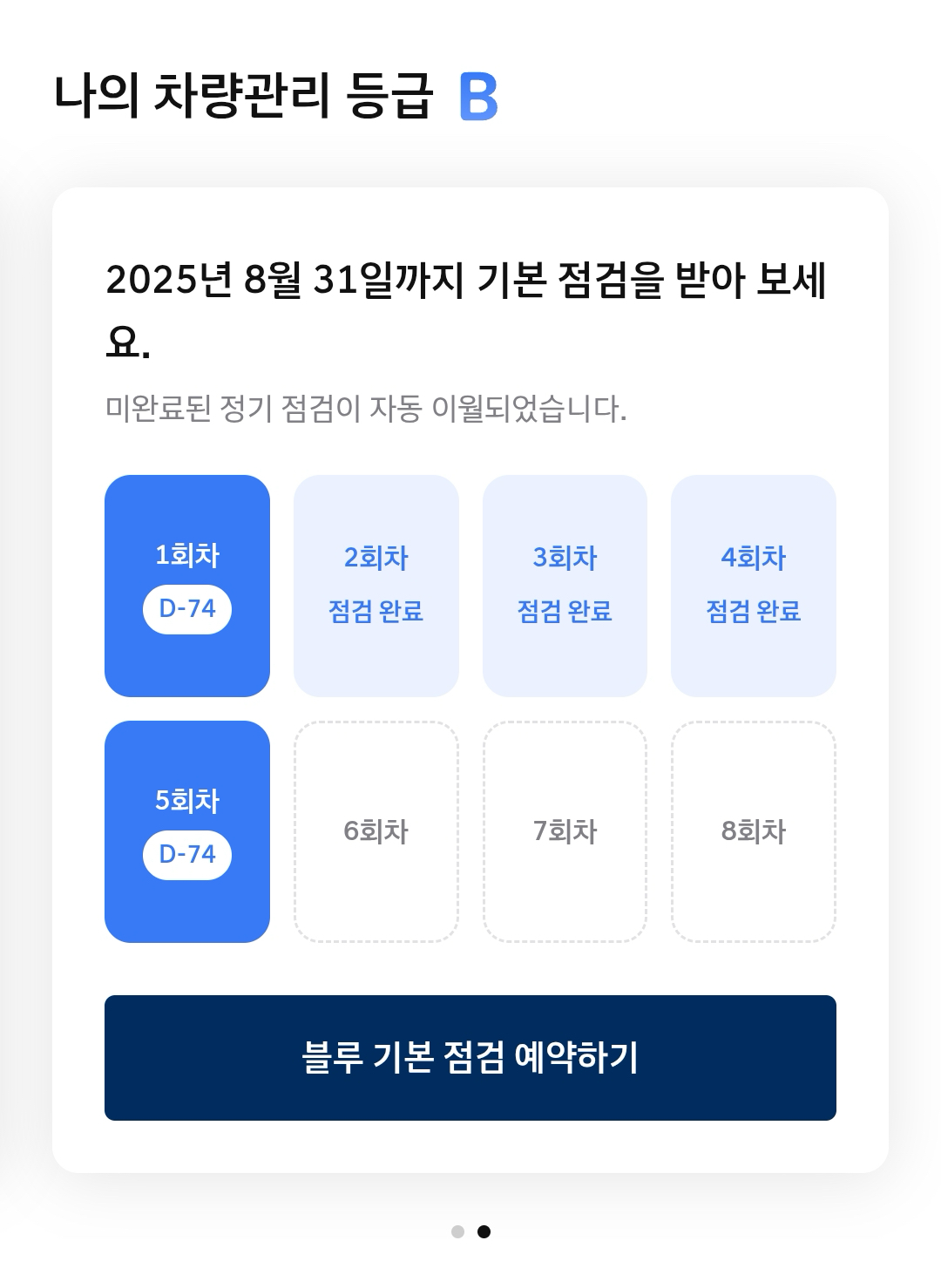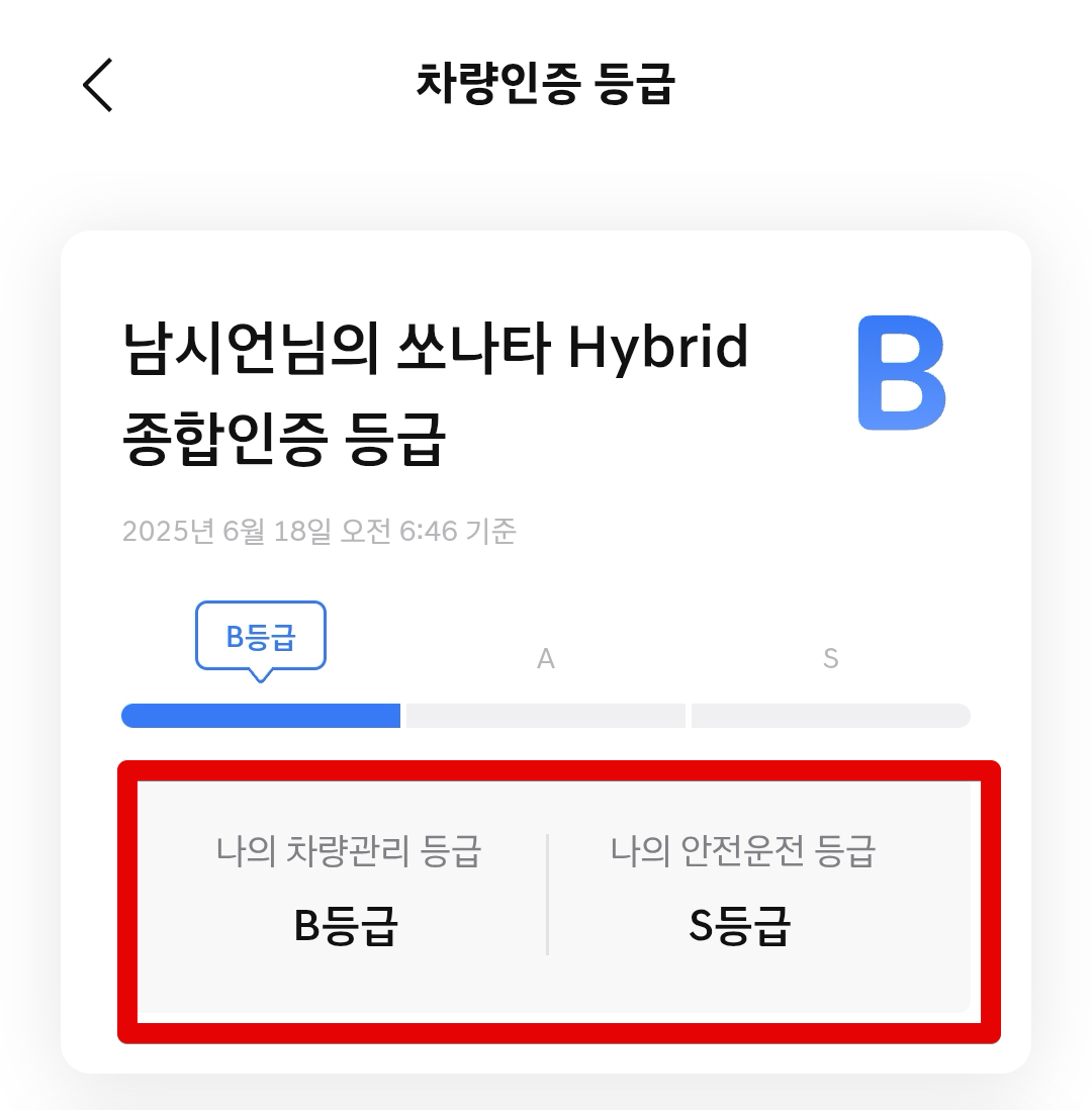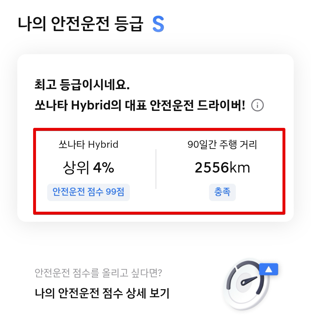 차량인증 등급도 볼 수 있다. 차량관리 등급이 있고 안전운전 등급이 있다. 5년차 정기점검을 올해 아직 받지 않았기 때문에 안받은걸로 표시돼 있다. 블루핸즈까지 가야하는데... 솔직히 좀 귀찮긴 하다. 예약도 해야하고... 안전운전 등급은 99점일 경우 상위 4% 정도 된다고 떠 있고 등급은 S이다. 이때 안전운전 점수의 경우 자동차 보험료에 반영할 수 있는 부분이 있기 때문에 신경쓰면 좋을 것 같긴 하다. (아래쪽에서 다시 설명함.)