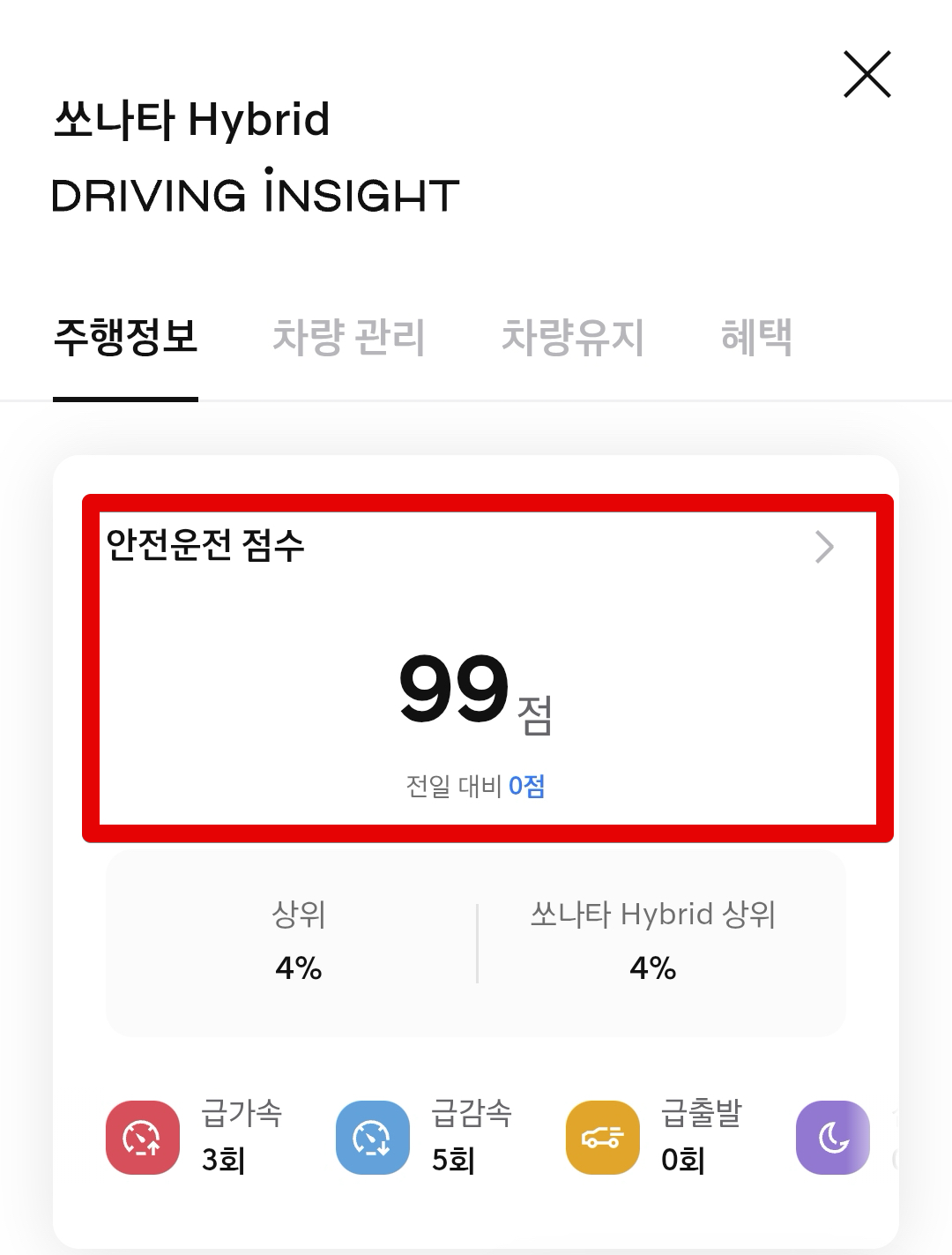대표적으로 주행 정보를 확인할 수 있는데 안전운전 점수를 볼 수 있다. 나는 99점이 나와있었다... 아래쪽에 급가속과 급감속 횟수도 적혀있고 급출발도 체크된다. 그런데 출퇴근 시간에 도심에서 차 막히는 구간에서는 급가속이나 급감속을 아예 안할 수도 없는 환경이 많다보니까 이런 부분은 좀 아쉽긴 하다.