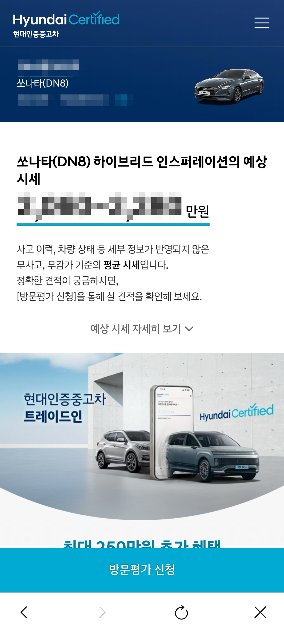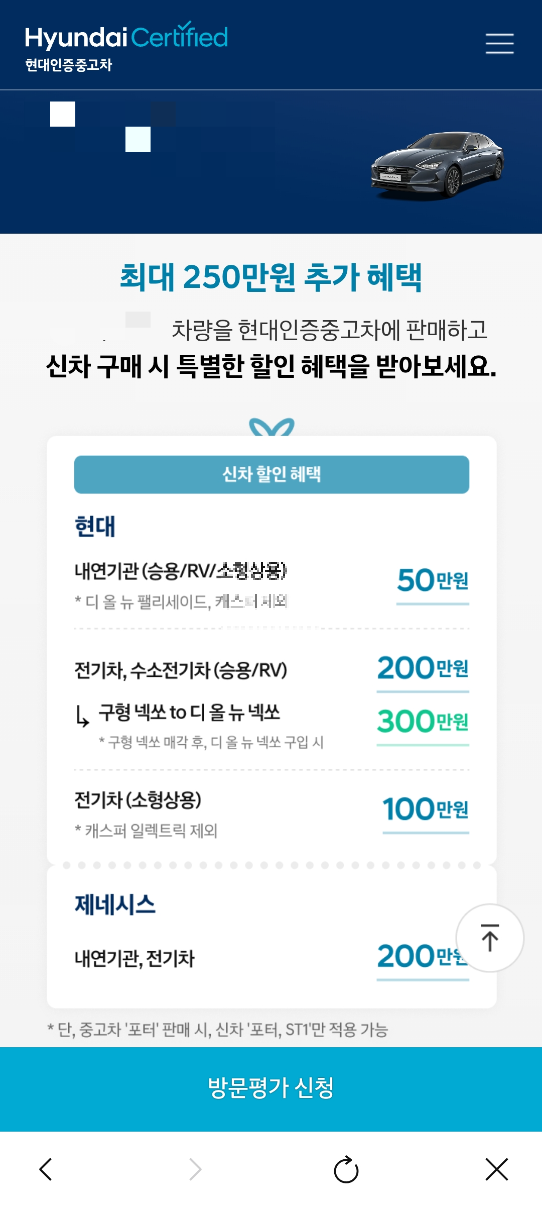 대략적인 중고차 시세를 확인할 수 있다. 더불어 방문평가 신청도 가능하다. 딱 1번은 신차구매시 할인혜택도 있다고 하니 참고해볼만할 것 같다.