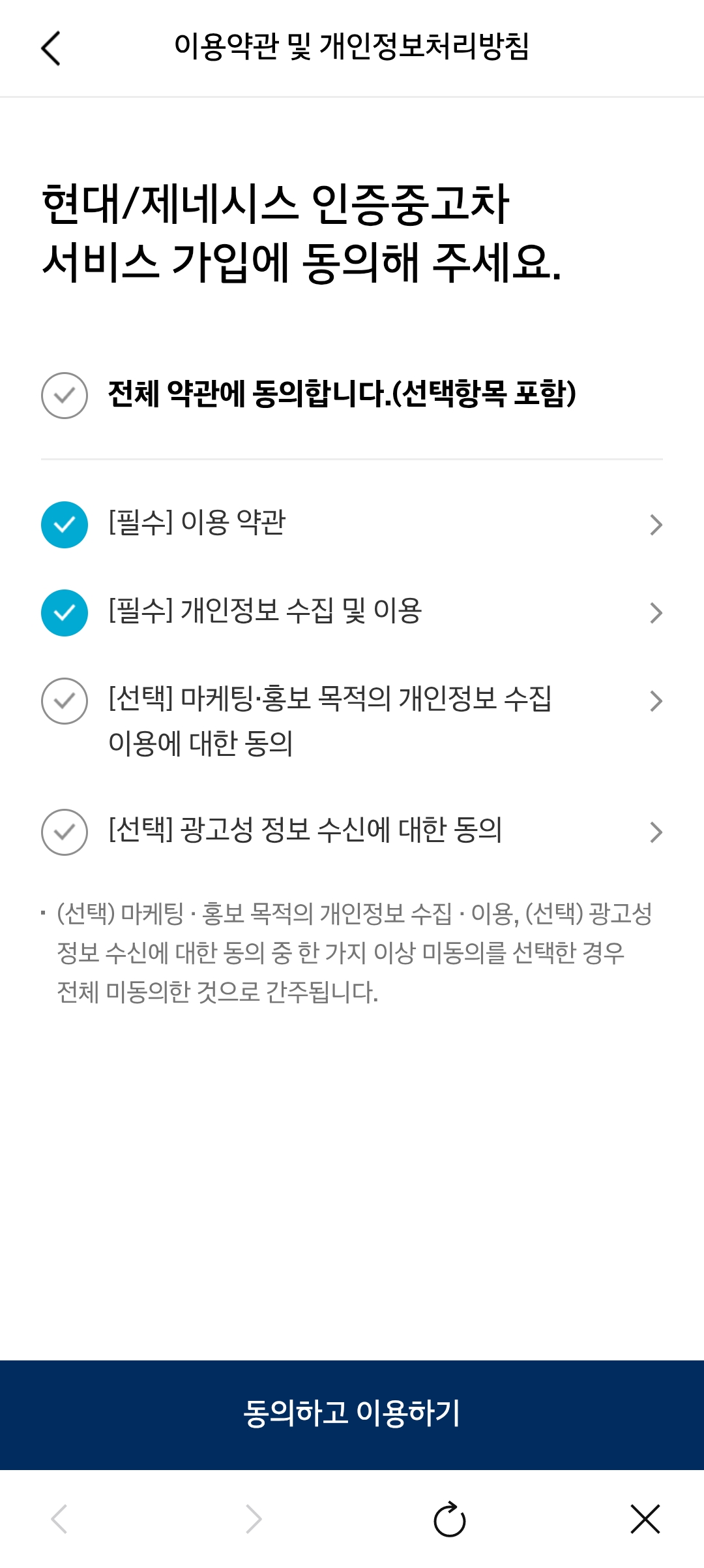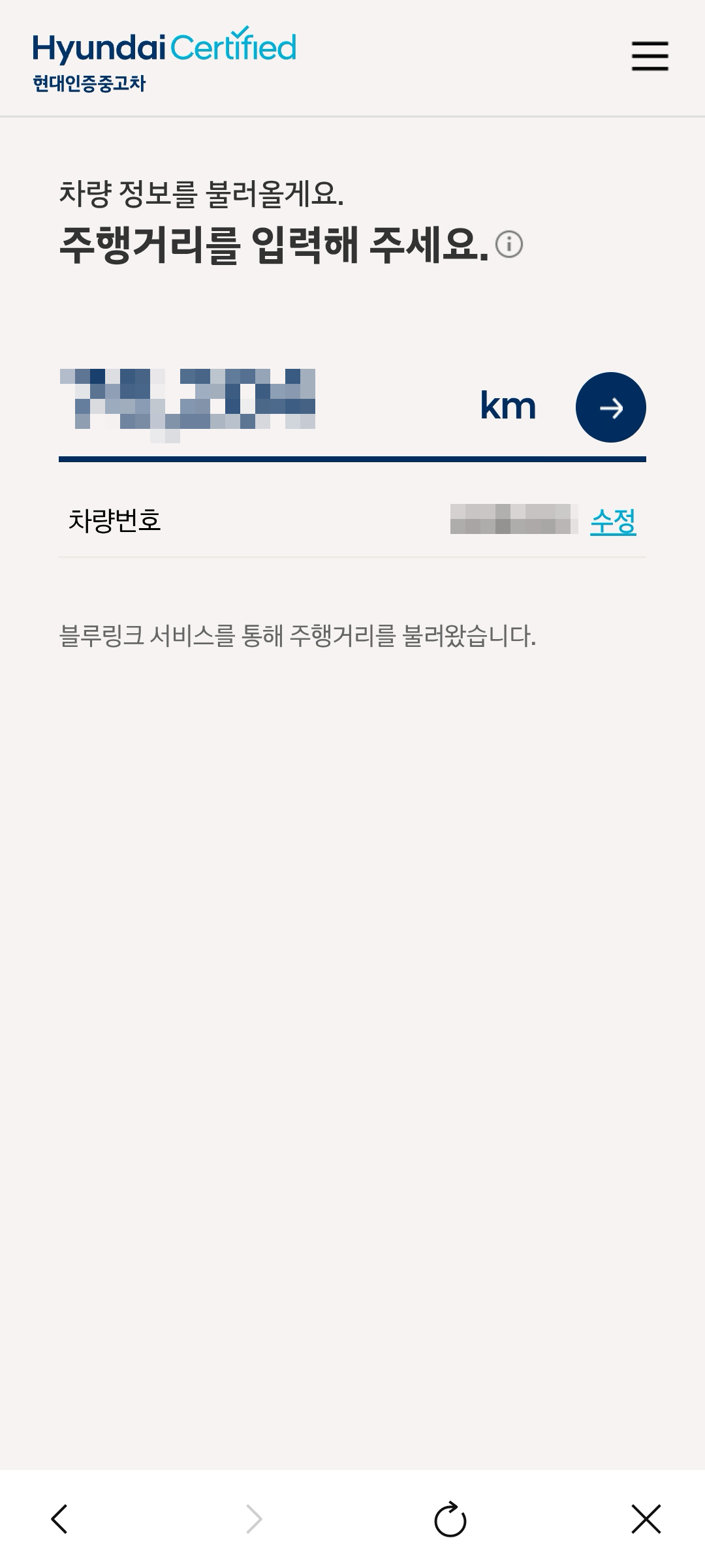 마이현대 앱에서 현대 인증 중고차 서비스에 가입하고 나의 주행거리를 연동된 값으로 입력해주면
