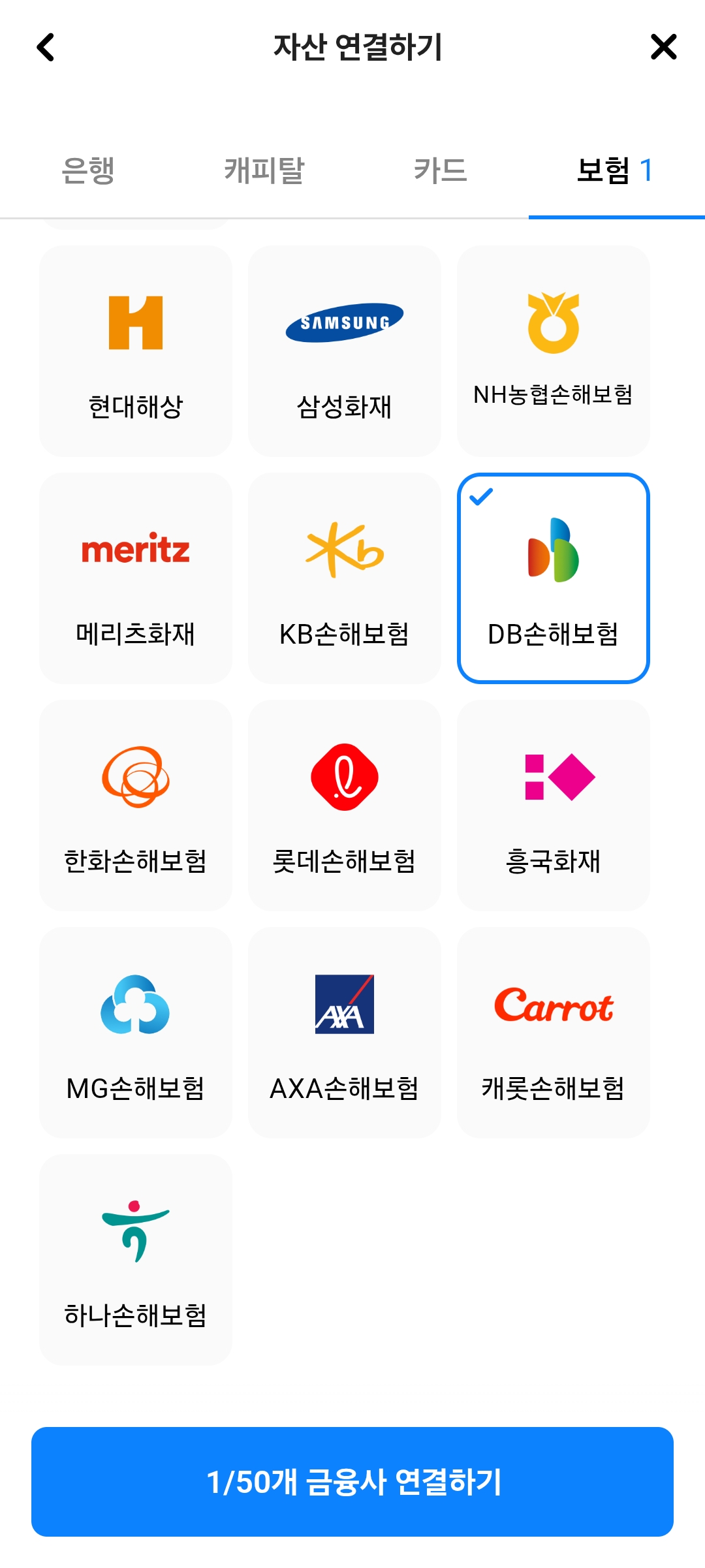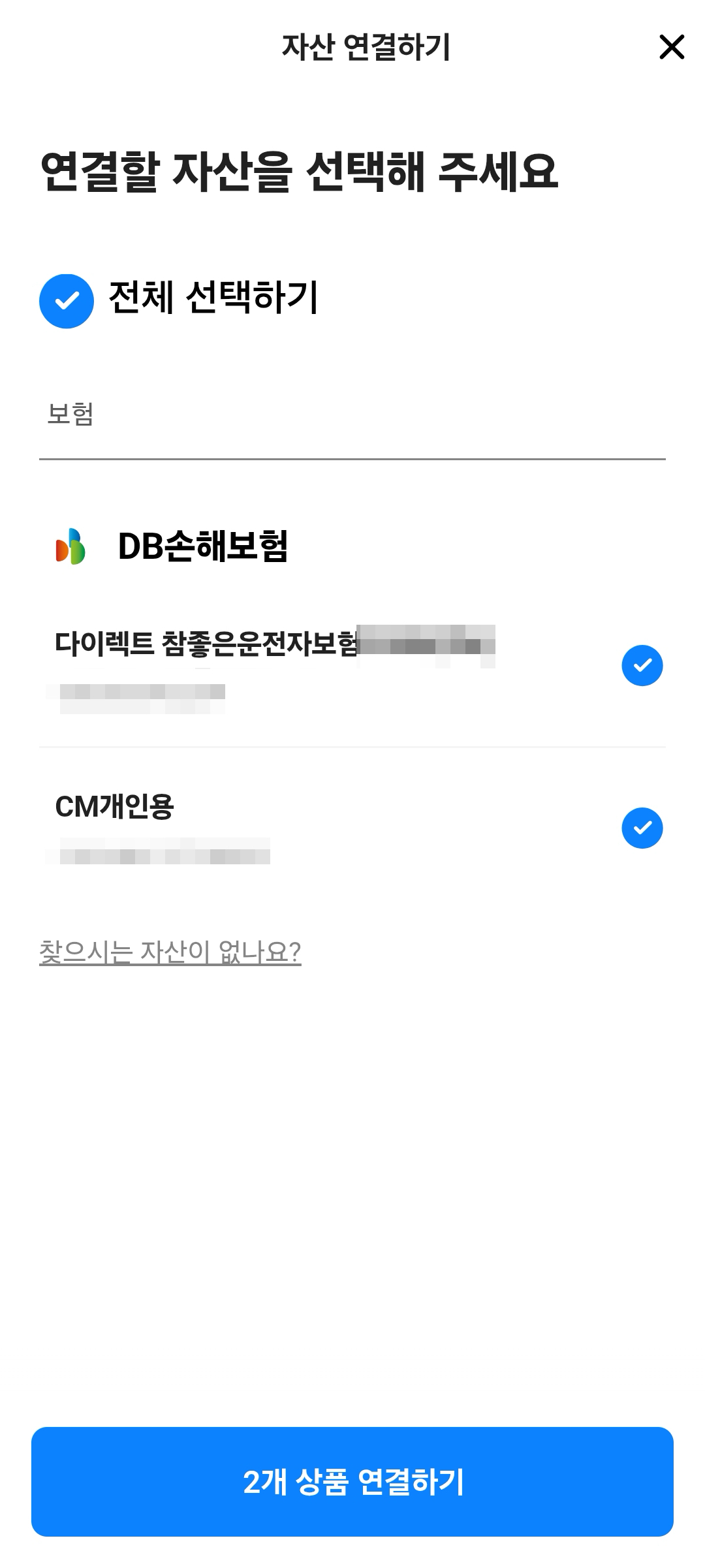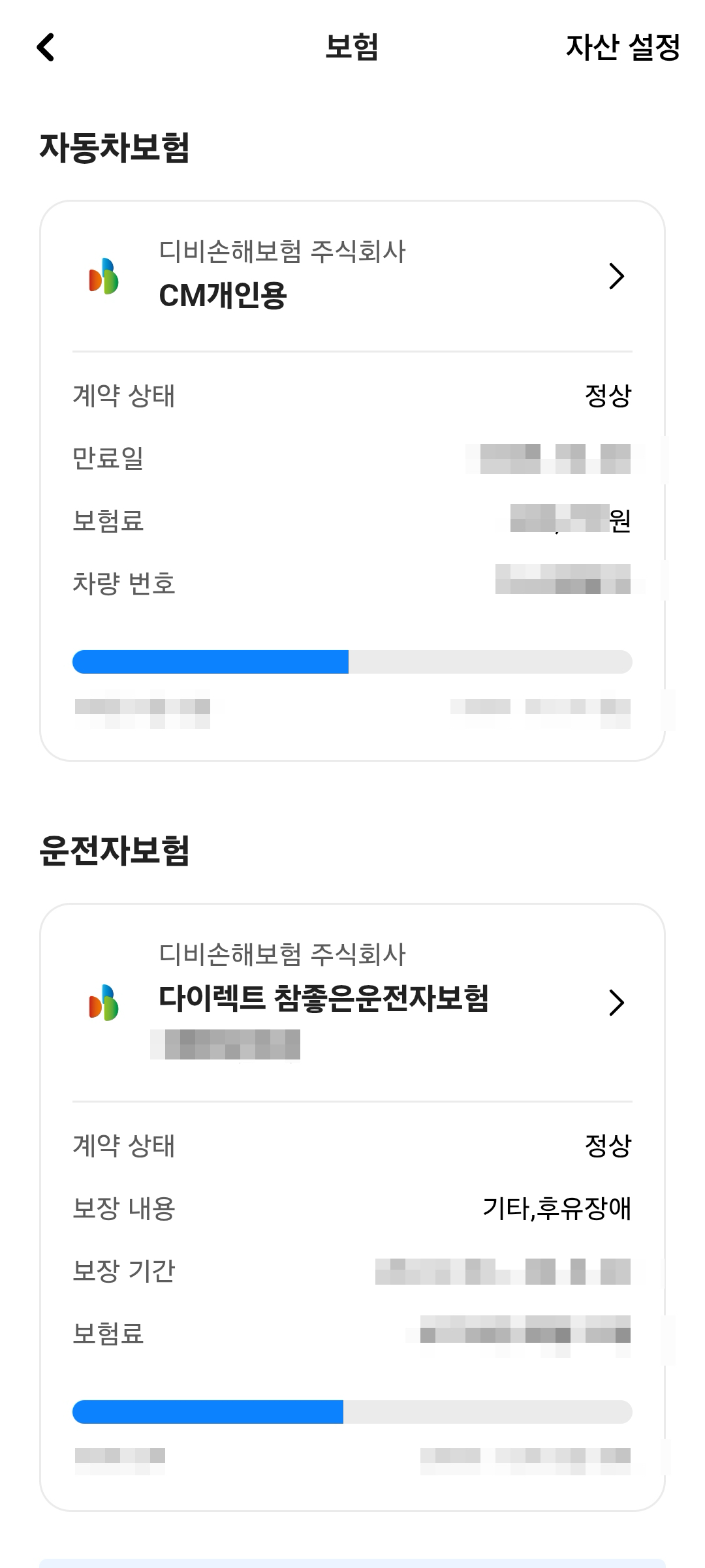 데이터 연동을 위해서 자산 연결할 보험사를 추가한다. 나의 경우 DB손해보험으로 가입 중이므로 여기를 클릭하고 연결하면 데이터가 연동되어 모든 내용을 확인할 수 있다. 나는 총 2개가 떴는데 하나는 자동차보험이고 하나는 운전자보험이다. 민식이법 등으로 인해 운전자들에게 요즘에는 운전자보험의 필요성이 대두되긴 했다. 자동차보험 자체는 원래 필수이고, 운전자보험은 선택사항인데 없는 사람도 많은걸로 알고 있지만, 비용이 저렴한 편이고 운전자보험에서 제공하는 변호사 선임 비용 측면이 꽤 괜찮다고 생각하고 있어서 혹시 모를 사고를 대비해 가입해두고 있다.