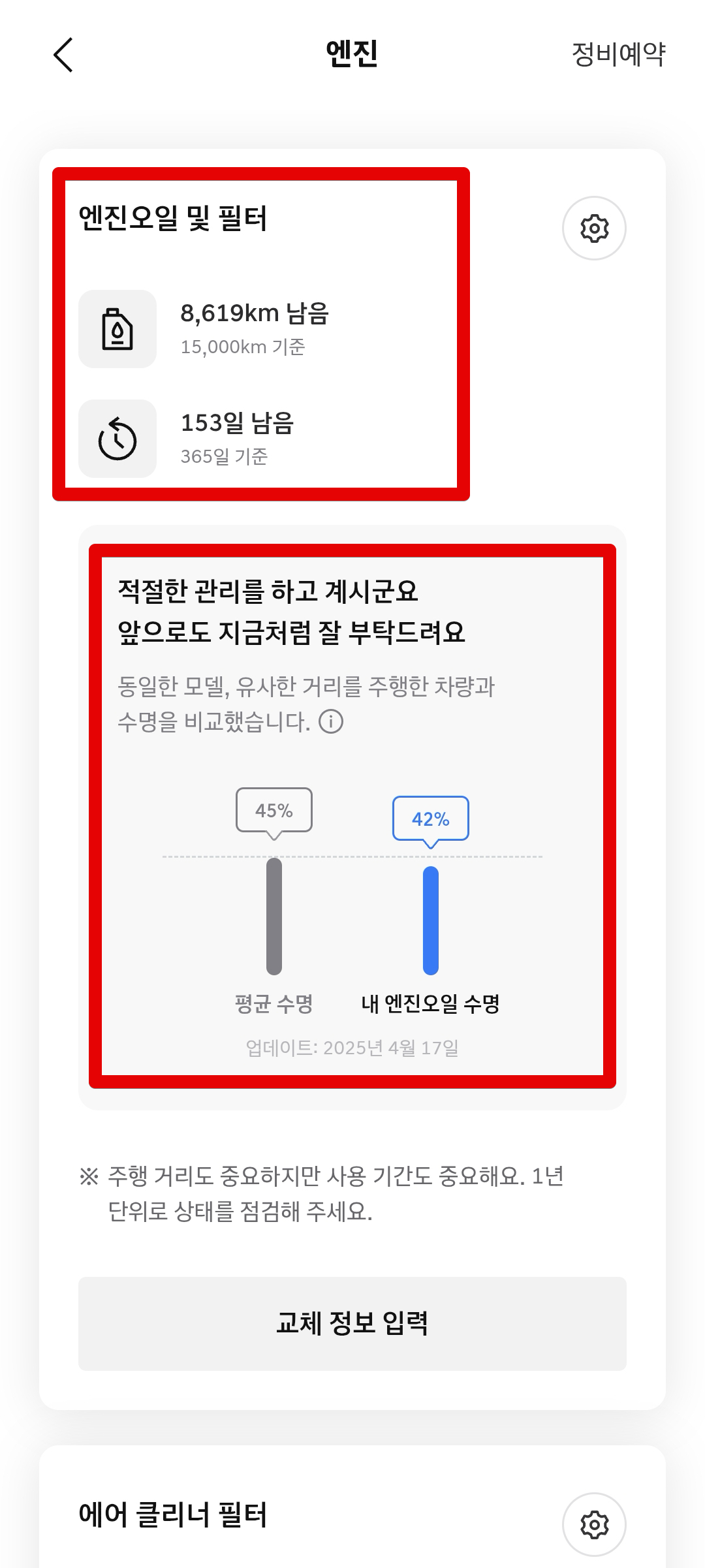 에어클리너 필터나 냉각수 남은 키로수, 브레이크 오일 키로수 등을 수치로 확인이 가능하다. 나의 경우 에어컨 필터 갈으라고 떠 있는데 예전에 갈았는데... 입력이 안되었나? 또 교체가 필요하다고 떠 있다. 뭐지 ㅋㅋㅋ