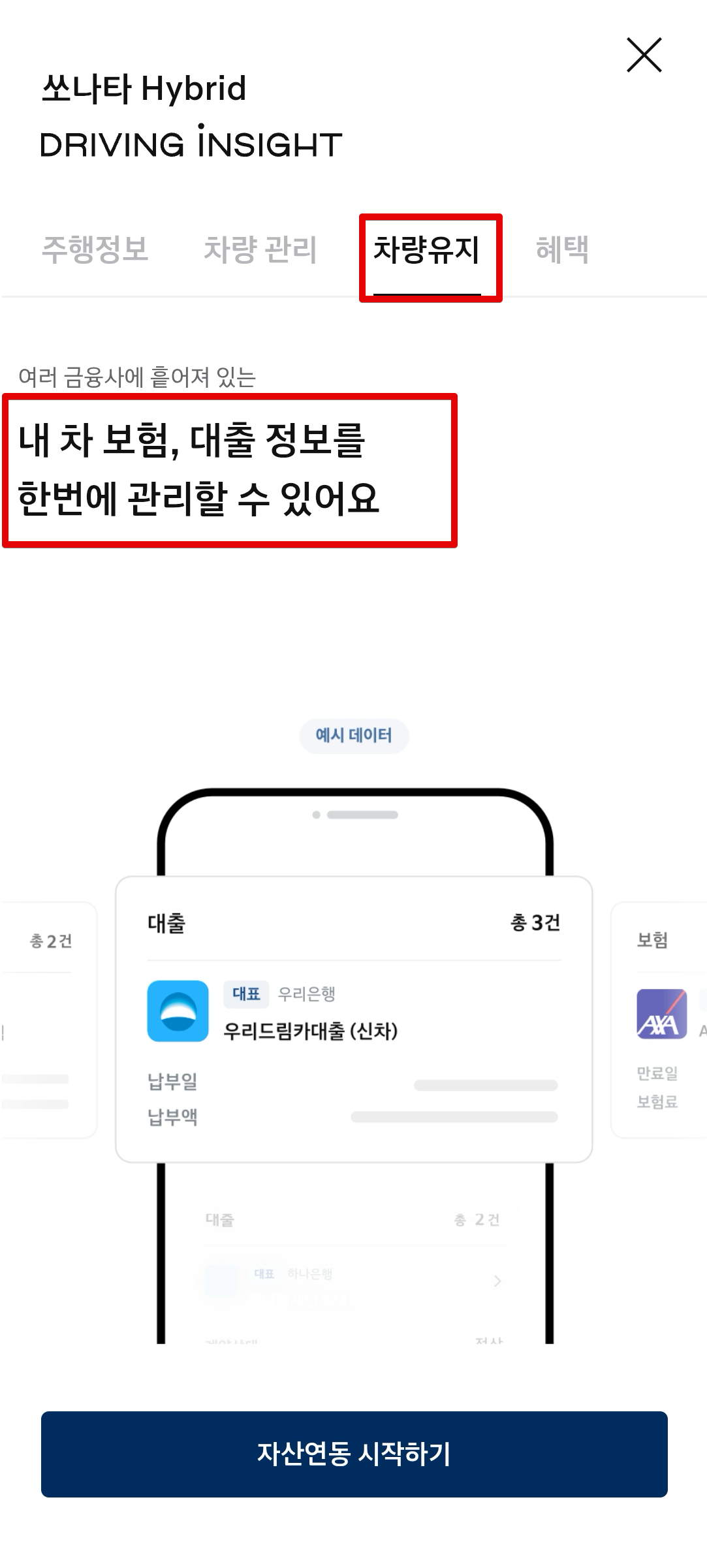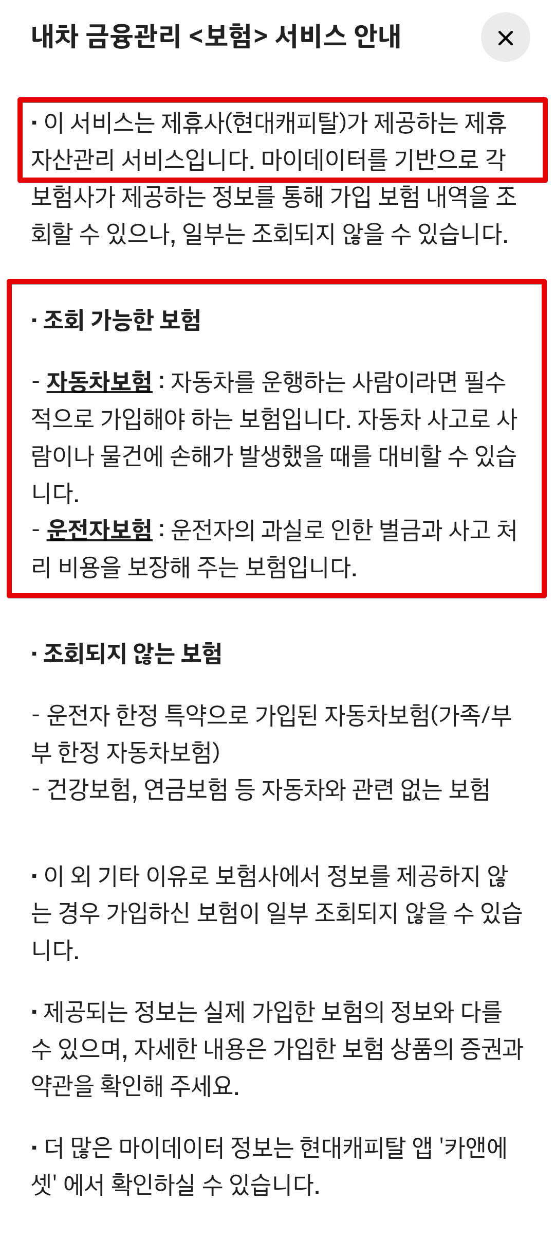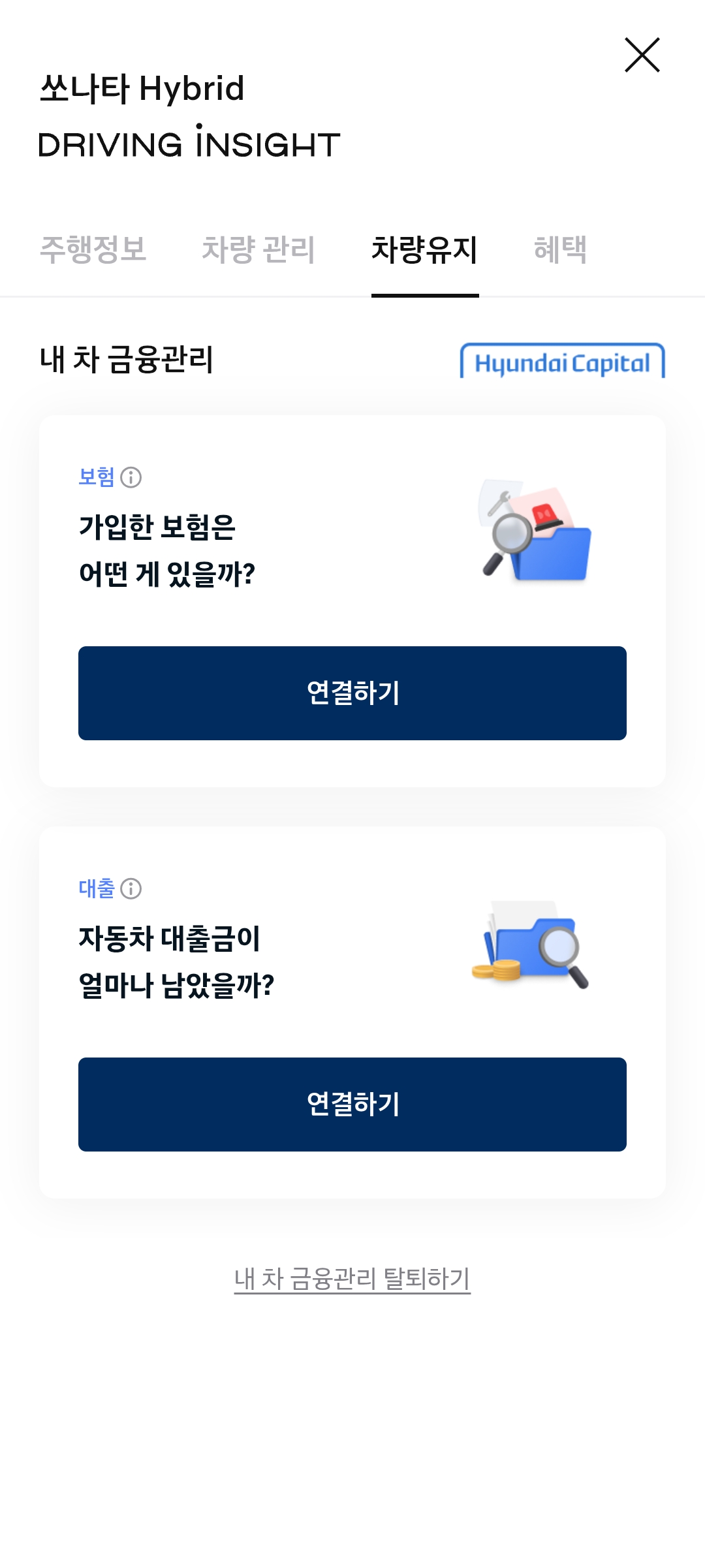 드라이빙 인사이트에서 또 재미있는 기능이 차량유지 메뉴에서 볼 수 있는 금융관리 부분이다. 특히 자동차 보험 관련된 내용을 연동해서 마이데이터 연동으로 볼 수 있고 해당 서비스는 현대캐피탈에서 제공하므로 현대캐피탈 약관에 동의해야만 이용할 수 있다. 자동차보험과 운전자보험 등 자동차 관련된 보험들만 조회된다. 다른 앱을 사용하지 않고 마이현대 앱에서 한꺼번에 보험까지 확인할 수 있어서 꽤 유용한 기능인 것 같다.