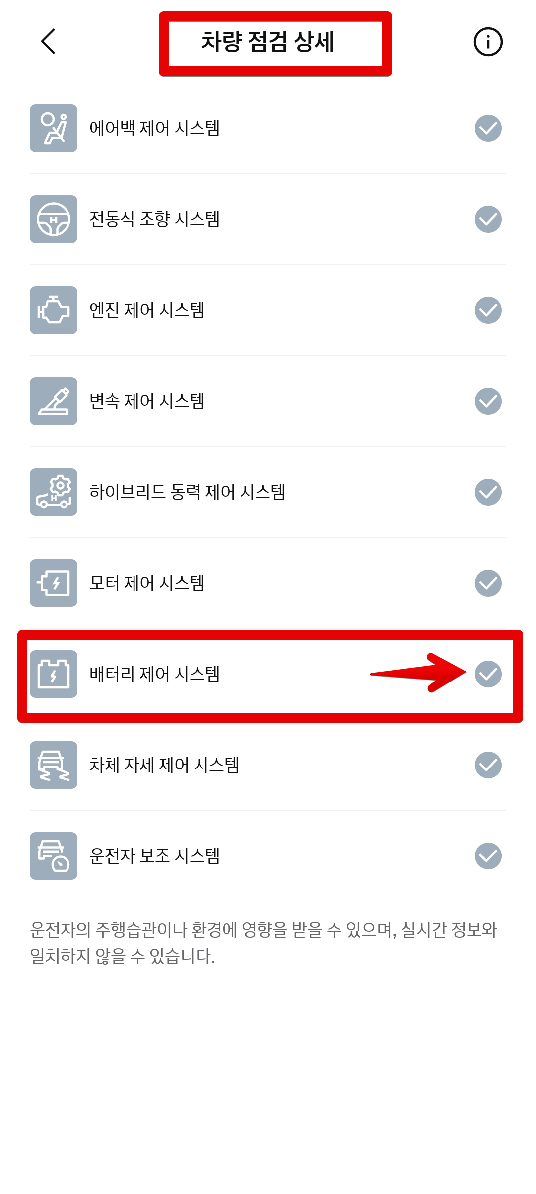 [차량 점검 상세]에서 [베터리 제어 시스템]을 확인하면 된다.