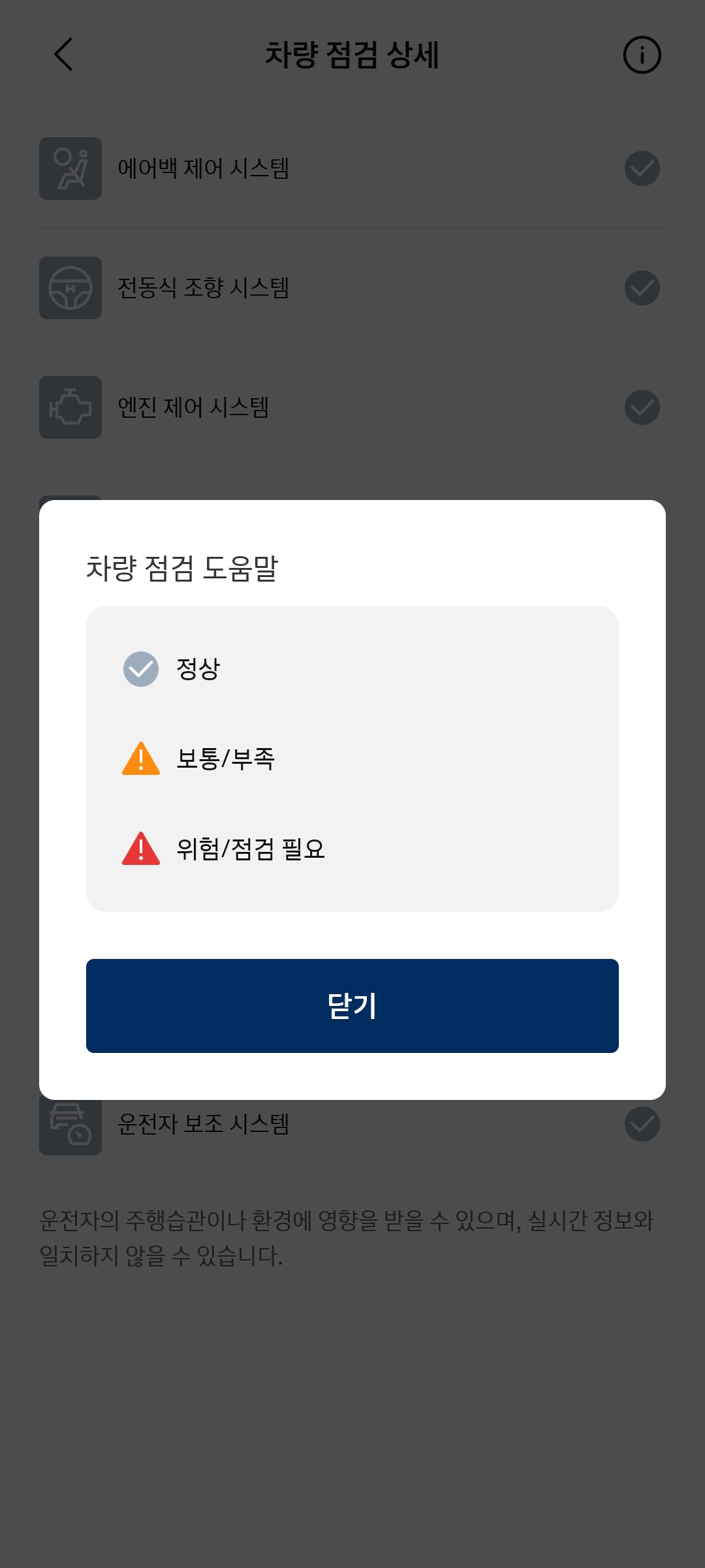 앱에서 차량 배터리 확인 시스템이 있다. 이 부분은 수치로 나오는건 아니고 정상/보통/위험 3단계로 아이콘으로만 표시된다. 장기주차를 해야하거나 5일~10일 이상 주차해놓고 운행하지 않을 때 배터리가 걱정될 수 있는데 이때 활용하면 좋을 기능이다.