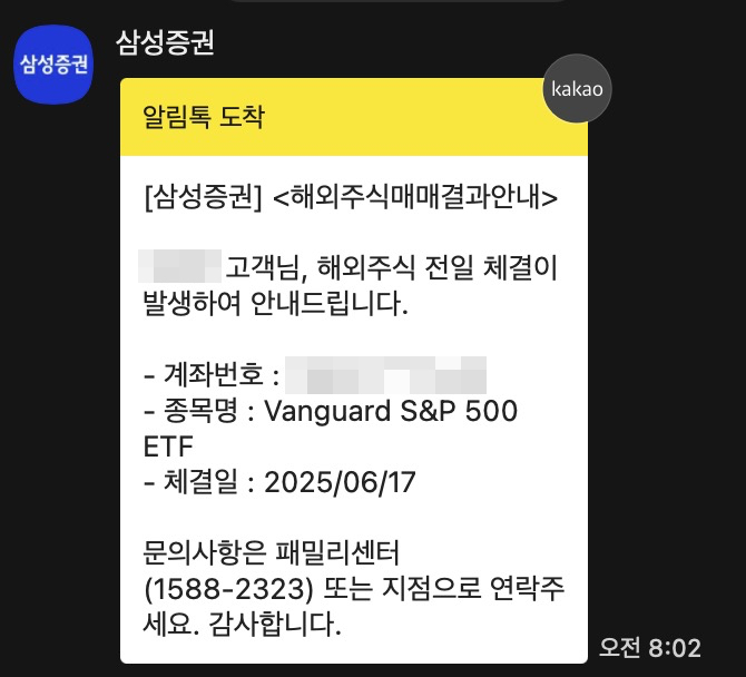 현재 미국 주식 시장의 경우에, 그리고 삼성증권에서는 주간거래를 허용하고 있지 않으므로 주간에 거래하려면 예약매수를 진행해야하고 예약매수 내역은 다음날 카톡으로 알려준다. 늦게 잠든다면 앱 알림으로도 받을 수 있긴 하다. 삼성증권 알림톡에서는 다른건 다 있는데 매수수량이 안적혀 있다.