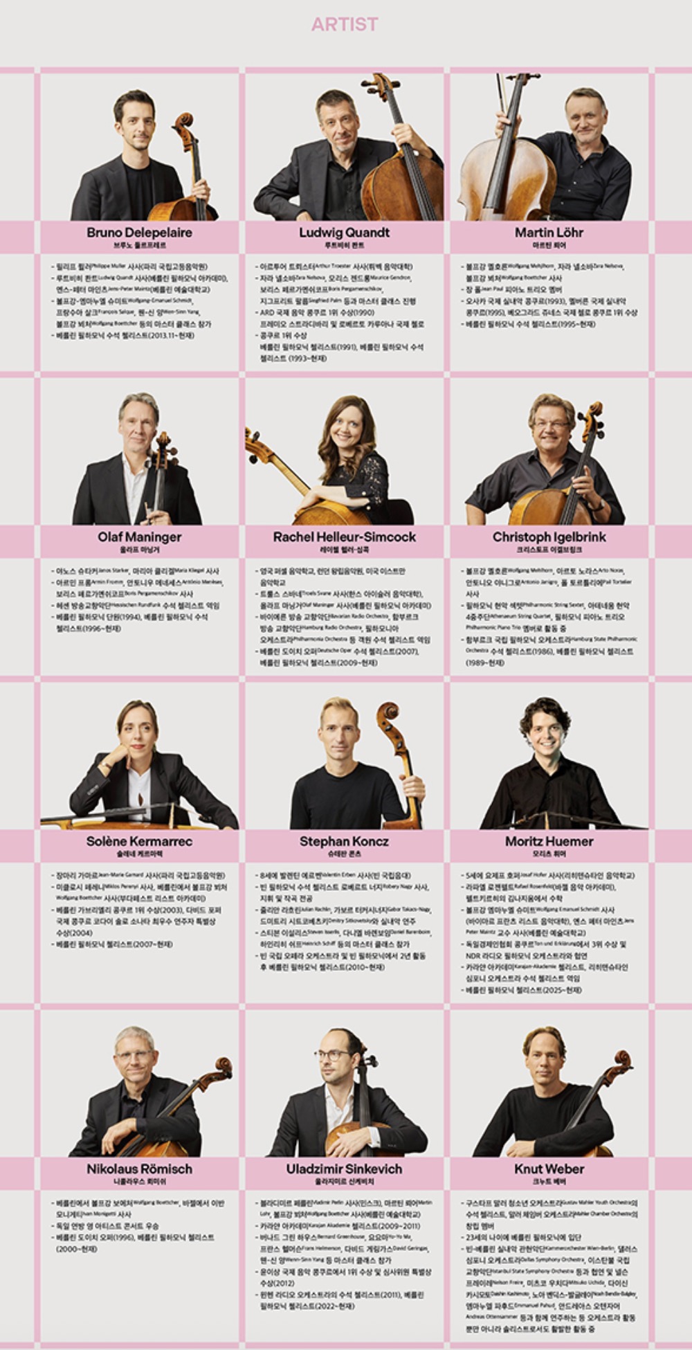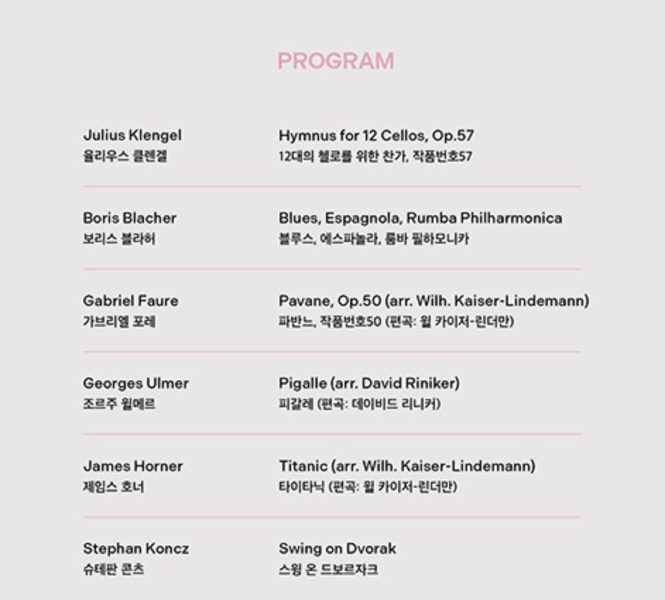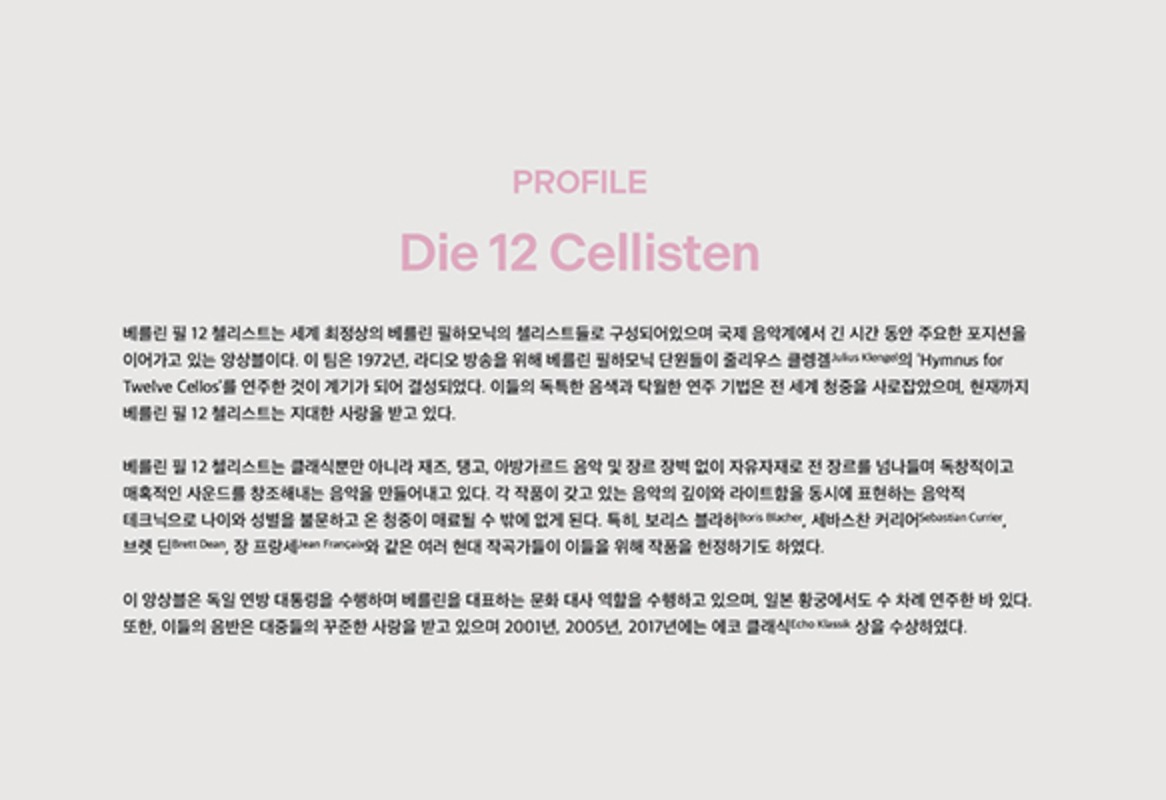 창립 멤버들은 이제 대부분 은퇴하거나 세상을 떠났지만, 베를린 필하모닉의 14명 첼리스트가 모두 이 단체에 소속되어서 그 전통을 이어가고 있어요. 무대에는 상황에 따라 14명 중 12명이 선발되어 올라간다고 하는데, 매번 최고의 조합을 만들려는 그들의 완벽주의가 느껴집니다.