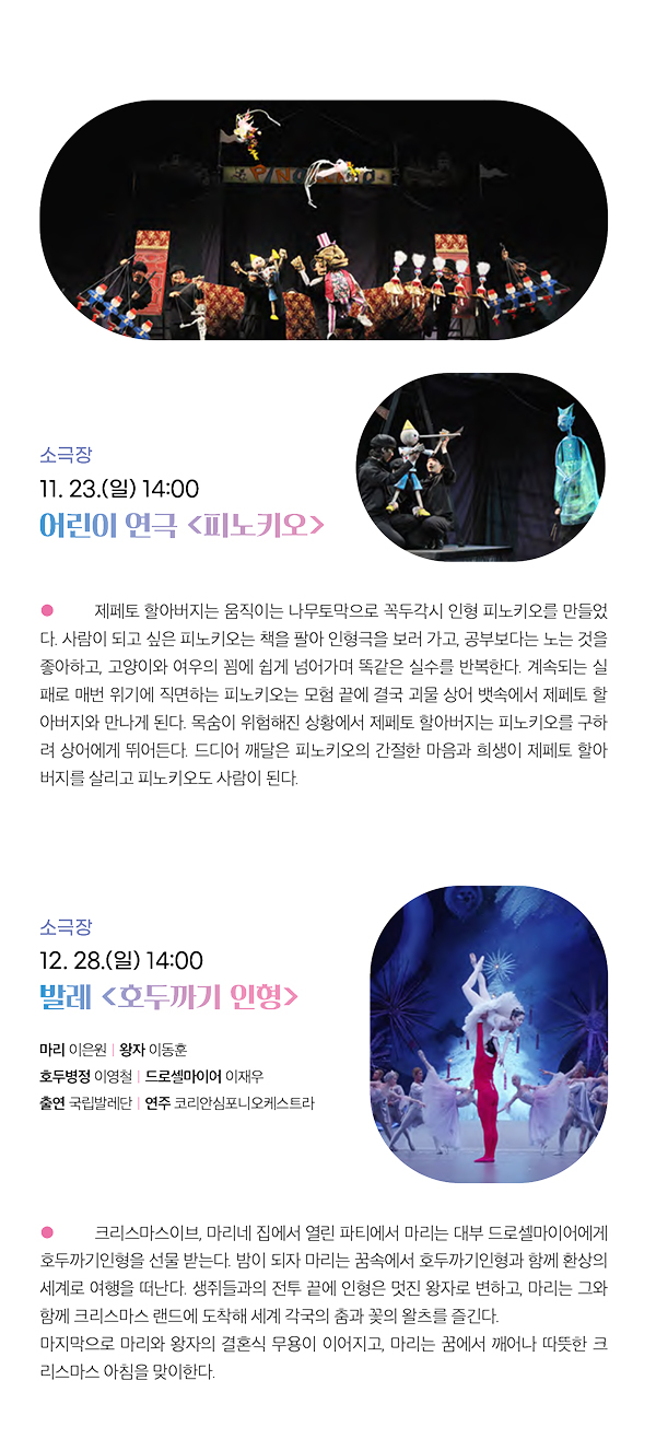 11월 23일에는 우리들의 영원한 고전 <피노키오> 이야기를 만나보세요. 제페토 할아버지가 만든 꼭두각시 인형 피노키오가 사람이 되고 싶어 하면서 벌어지는 모험담입니다.