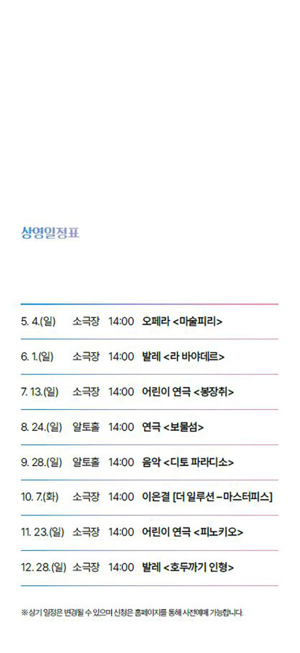 2025년 5월부터 12월까지 수성아트피아에서 영상으로 만나는 명작이라는 주제로 수성아트피아 소극장 알토홀에서 만나볼 수 있는 프로그램입니다. 해당 프로그램은 예술의전당 공연 실황 영상 관람으로, 티켓 예매하기가 아닌 사전 신청 링크를 통해 신청받는다고하니 참고해주세요. 전석 무료입니다!