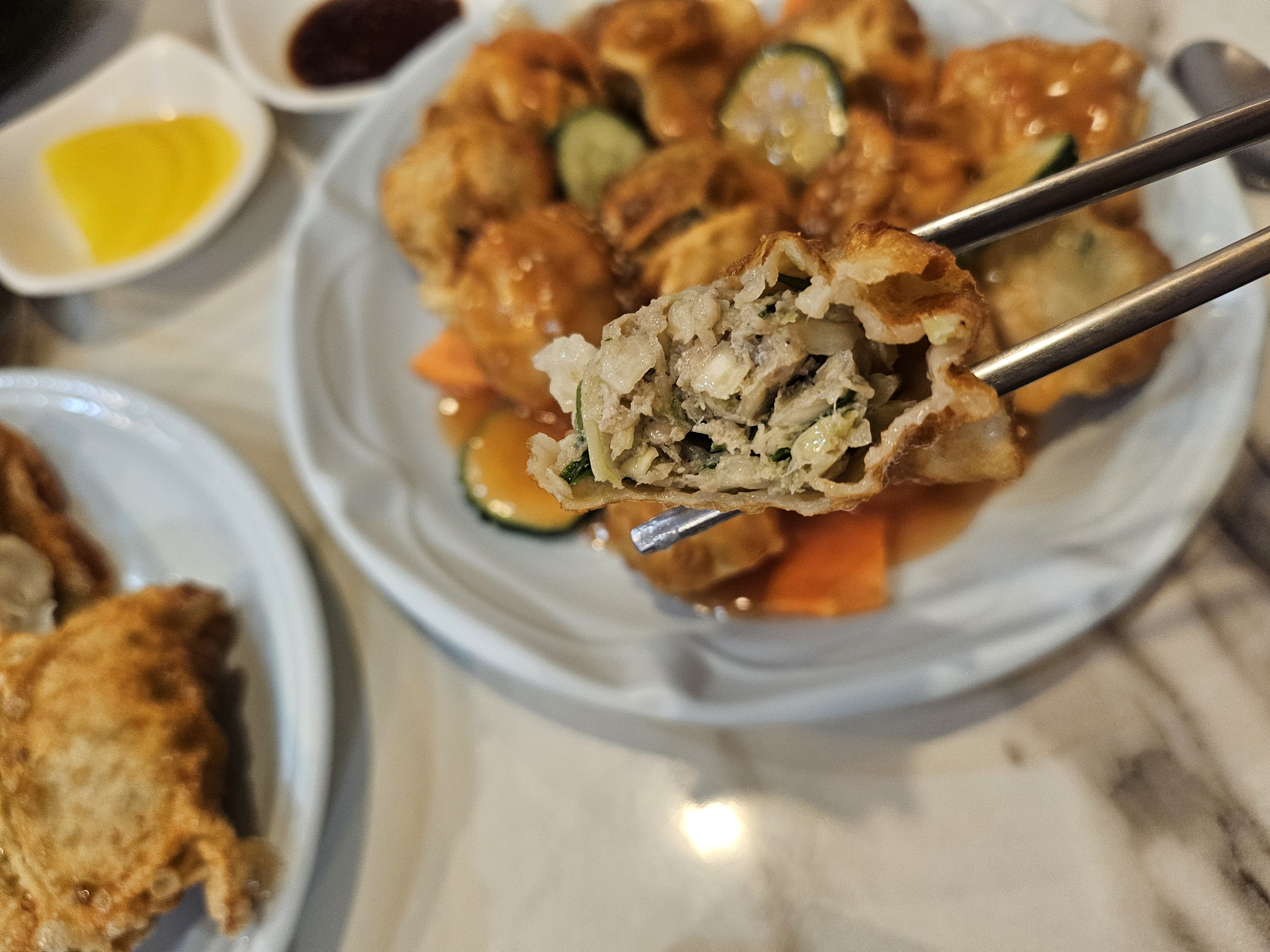 만두는 속이 거의 가득찬 스타일인데 요즘 인기있는 비비고 만두처럼 식감이 아삭한 편은 아니고 약간 옛날식 만두처럼 식감이 다소 묵직한... 대충 그런 느낌이다. 오히려 좋아. 우리집까지 배달됐으면 진짜 맨날 시켜먹을텐데... 아쉽다.