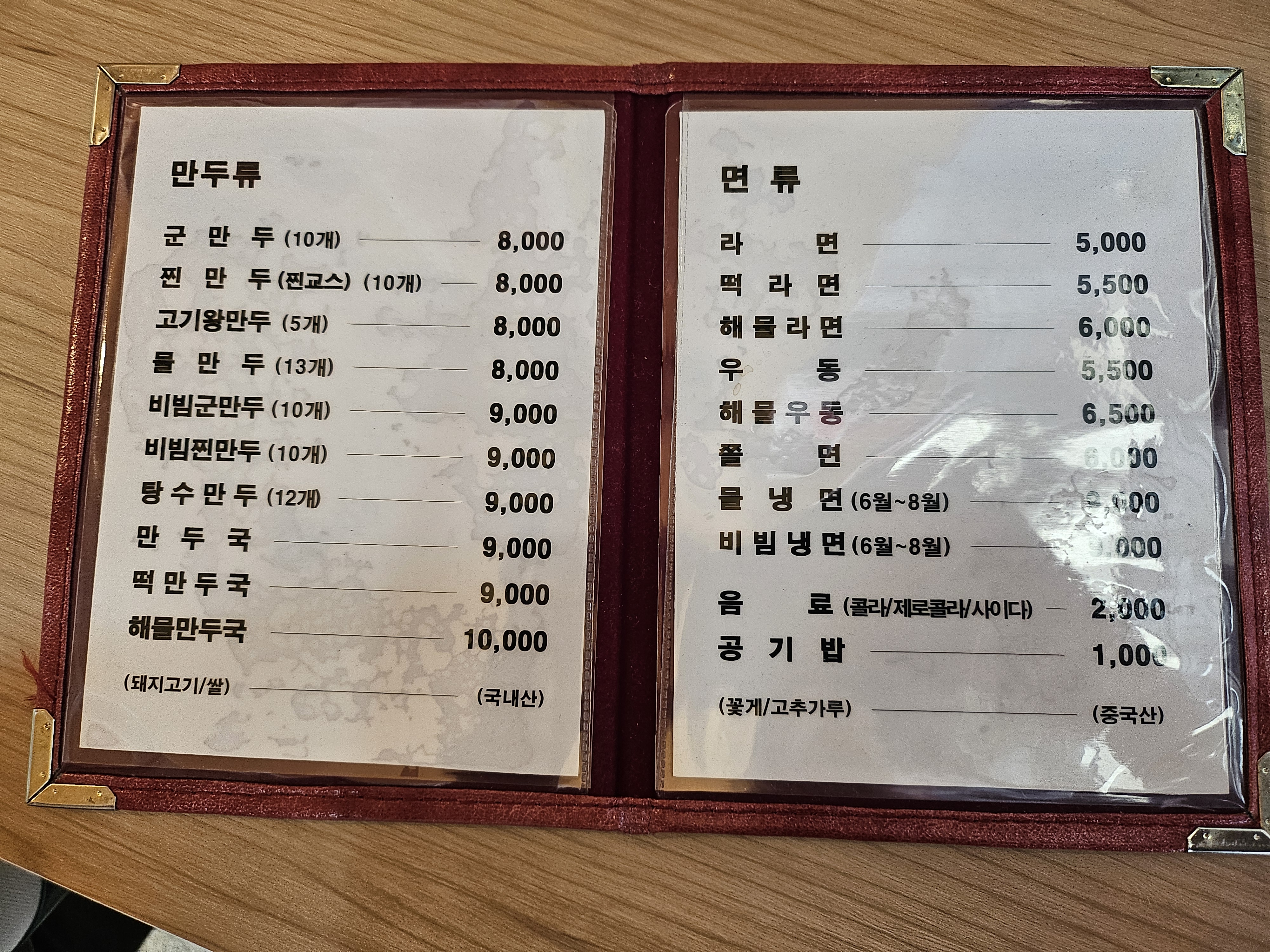 메뉴판. 다양한 만두류가 있고 군만두와 만두국 등도 있다. 하지만 내가 알기로 표준표기법은 만둣국인걸로 알고 있다. 아무튼 다음번엔 만둣국을 먹어볼 생각이고 이번에는 처음 간터라 만두류랑 우동을 먹어보았다.