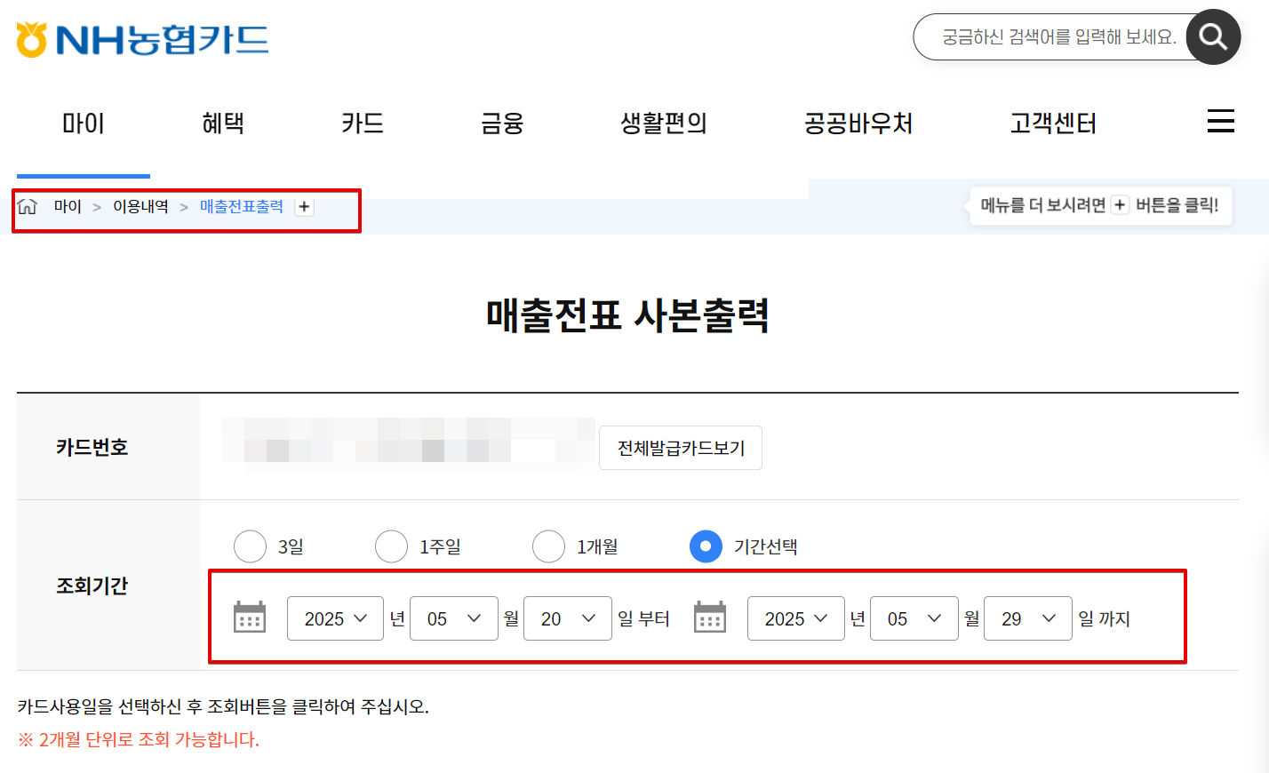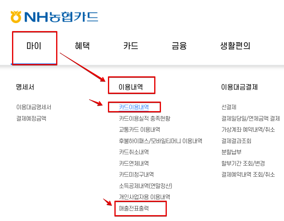 NH농협카드 홈페이지에 로그인한 후 [마이]에서 [이용내역]쪽을 살펴보면 [카드이용내역]이 있고 [매출전표출력]이 있는데 한쪽에 기능이 통합돼 있는게 아니라 기능이 분리되어 있다. 그래서 카드이용내역을 확인할 목적이라면 [카드이용내역]으로 들어가면 되고, 영수증 출력을 위해서라면 [매출전표출력]으로 들어가야한다.