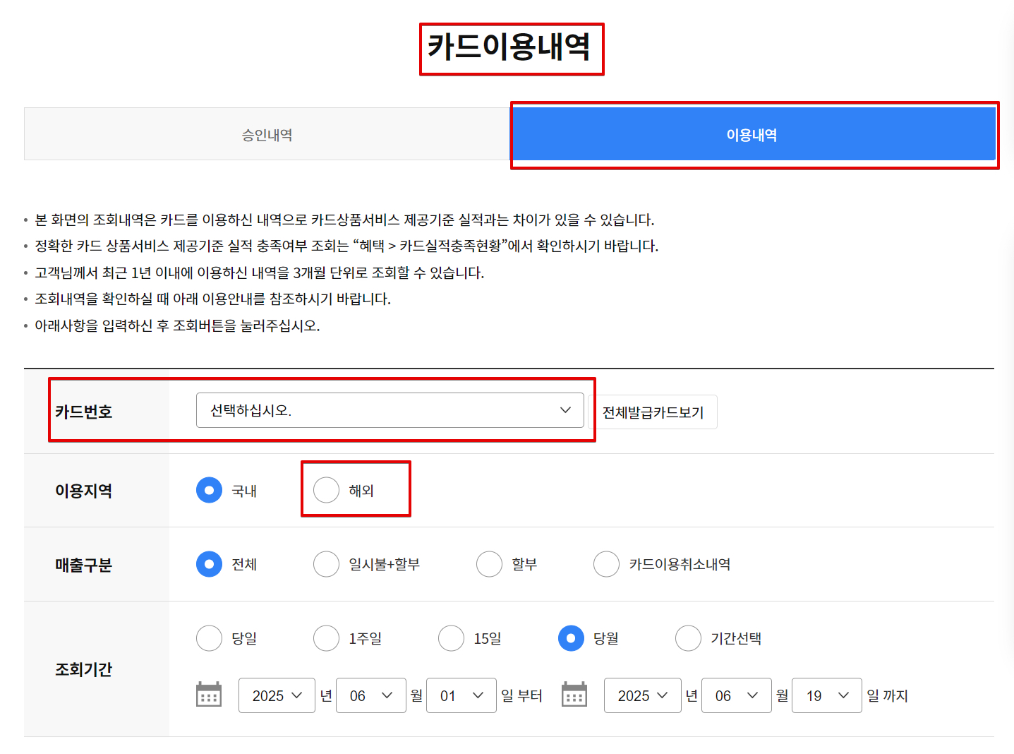 카드이용내역에서 카드를 선택하고 이용지역을 [해외]로 변경한 후 조회하면 된다. 왜 이렇게 복잡하게 분리해놨는지는 솔직히 잘 모르겠다.
