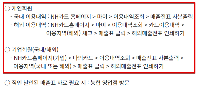 농협 신용카드 해외결제 매출전표 사본 출력 방법