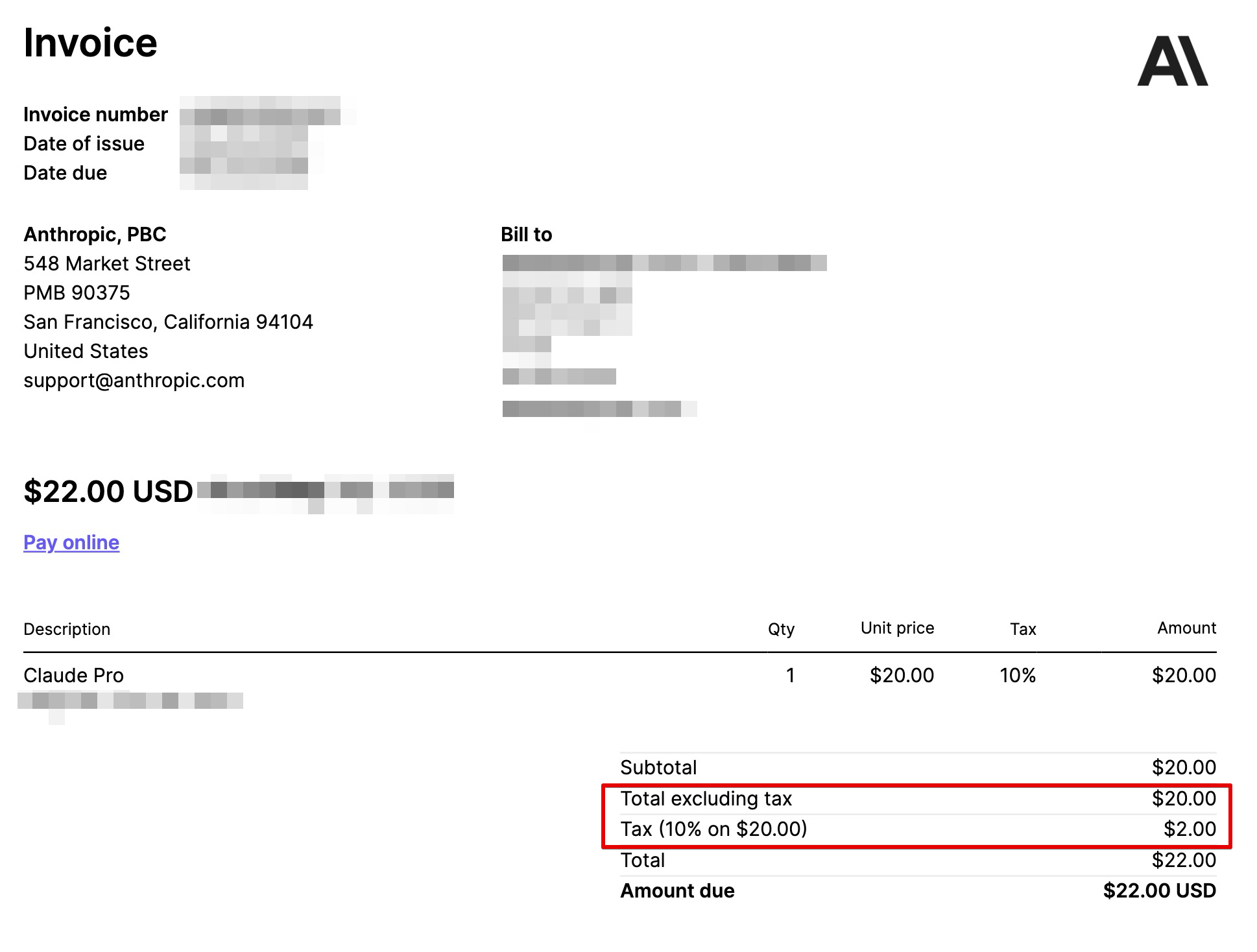 클로드 AI 결제 후 나타나는 인보이스를 보게되면 tax를 지출하였다. 인보이스 어디에도 사업자번호가 없고, 실제로 한국에 사업자가 없다.