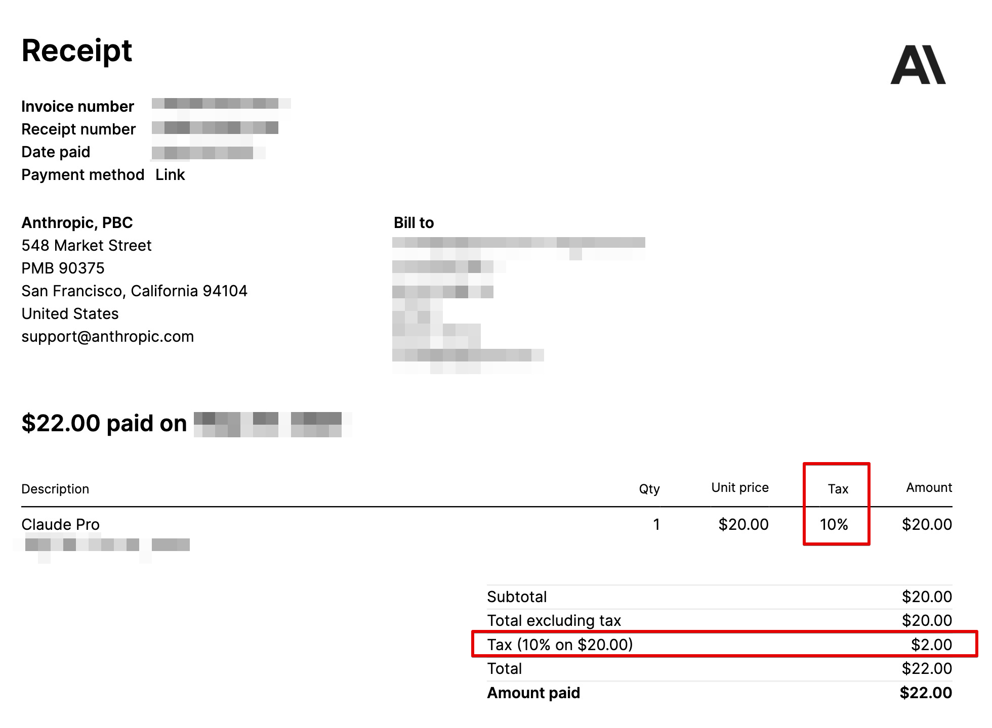 클로드 AI 결제 후 나타나는 인보이스를 보게되면 tax를 지출하였다. 인보이스 어디에도 사업자번호가 없고, 실제로 한국에 사업자가 없다.