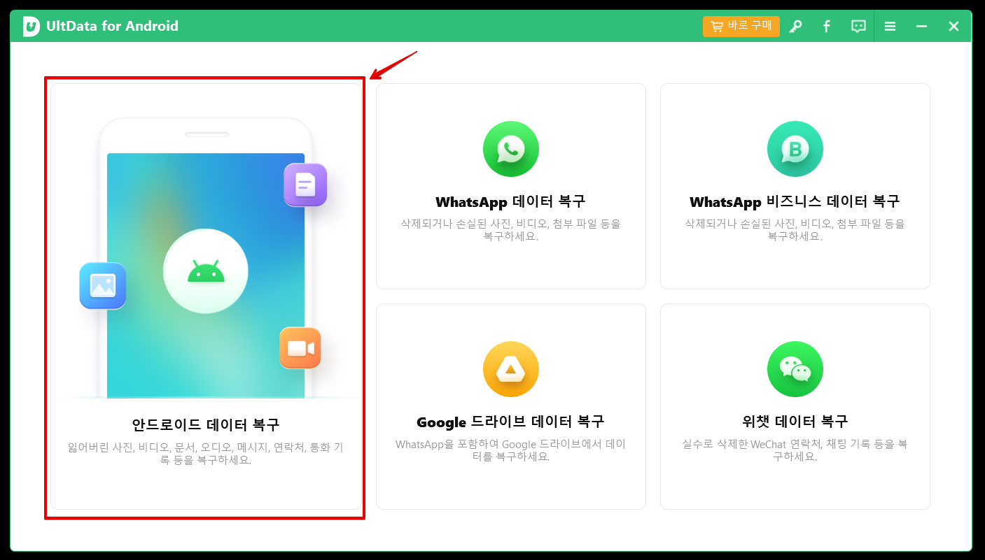설치 후 실행하게 되면 위와 같은 화면이 나타나는데 여기에서 제일 왼쪽에 있는 [안드로이드 데이터 복구]를 클릭합니다. 한국에서는 왓츠앱은 잘 사용하지 않으므로 그냥 넘어가면 됩니다.