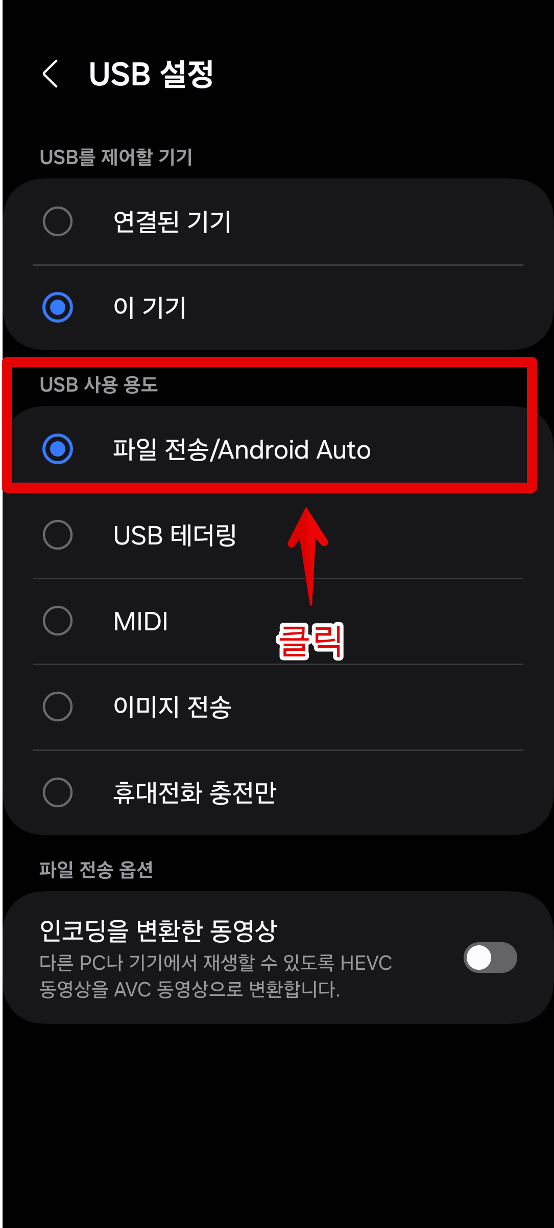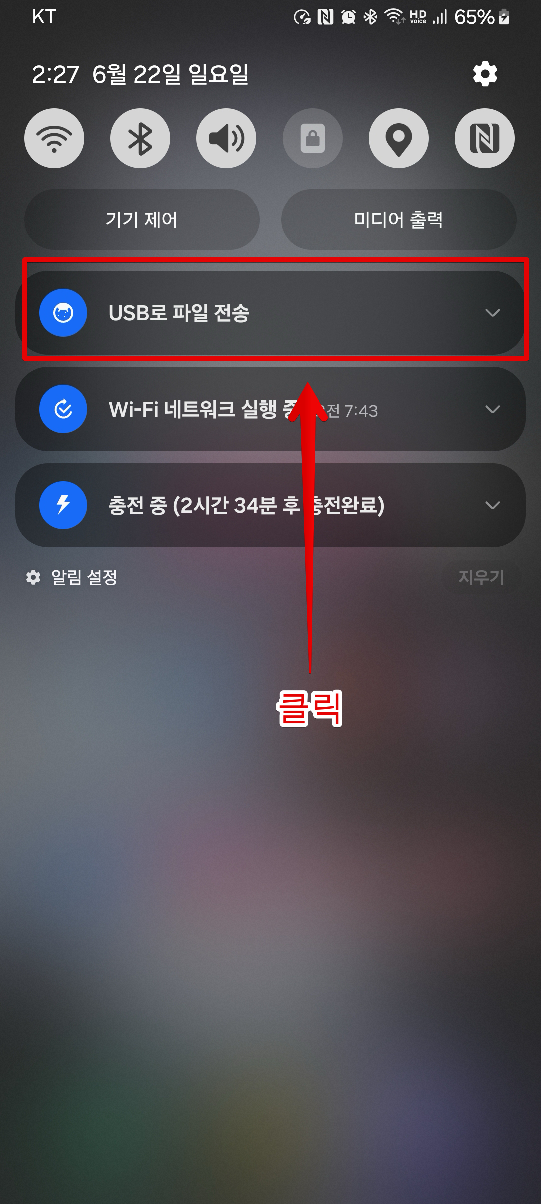 제일 먼저 안드로이드 갤럭시 폰에서 밑으로 쓸어내리기해서 [USB로 파일 전송]을 클릭합니다. 다음으로 [파일 전송/Android Auto]를 선택합니다. 이후 위 검색창에 '빌드'라고 검색하면 [빌드 번호] 메뉴가 나오는데 클릭합니다.