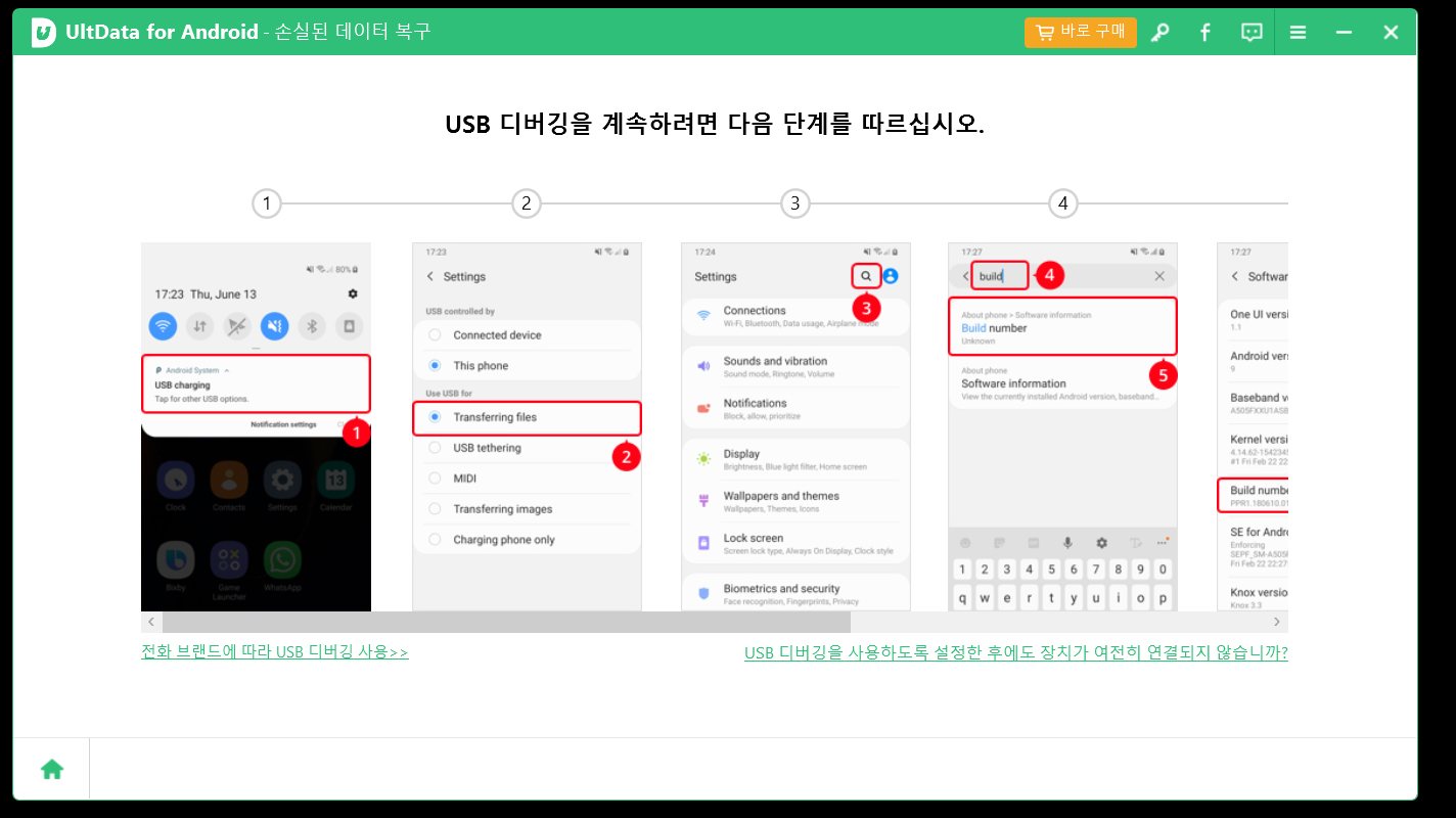 이제 스마트폰을 USB 선으로 컴퓨터와 연결해주세요. 이때 USB 디버깅 과정을 하기 위해 스마트폰에서 개발자 옵션을 활성화해야하는 과정이 필요합니다. 갤럭시 핸드폰을 USB 케이블로 컴퓨터에 연결하고, 핸드폰에서 USB 디버깅 모드를 활성화해야 합니다. 프로그램에서 친절하게 단계별로 안내해 주니까 따라하시면 어렵지 않지만, 영문 버전으로 설명돼 있으므로 아래에 있는 가이드라인을 따라서 진행하세요.