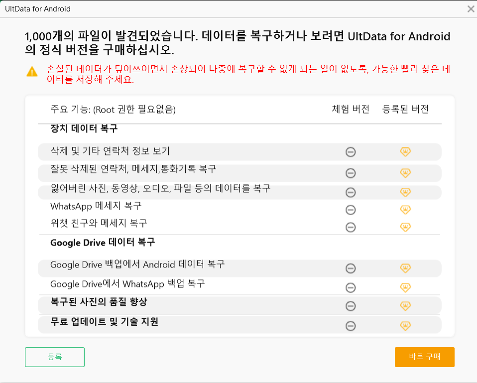 갤럭시 핸드폰에서 소중한 데이터를 잃어버렸을 때 당황하지 마시고, 우선 UltData for Android의 무료 스캔 기능부터 활용해 보세요. 복구 가능성을 확인한 후에 비용을 지불하는 방식이라서 훨씬 합리적이고 안전하게 데이터 복구를 시도해 볼 수 있습니다.