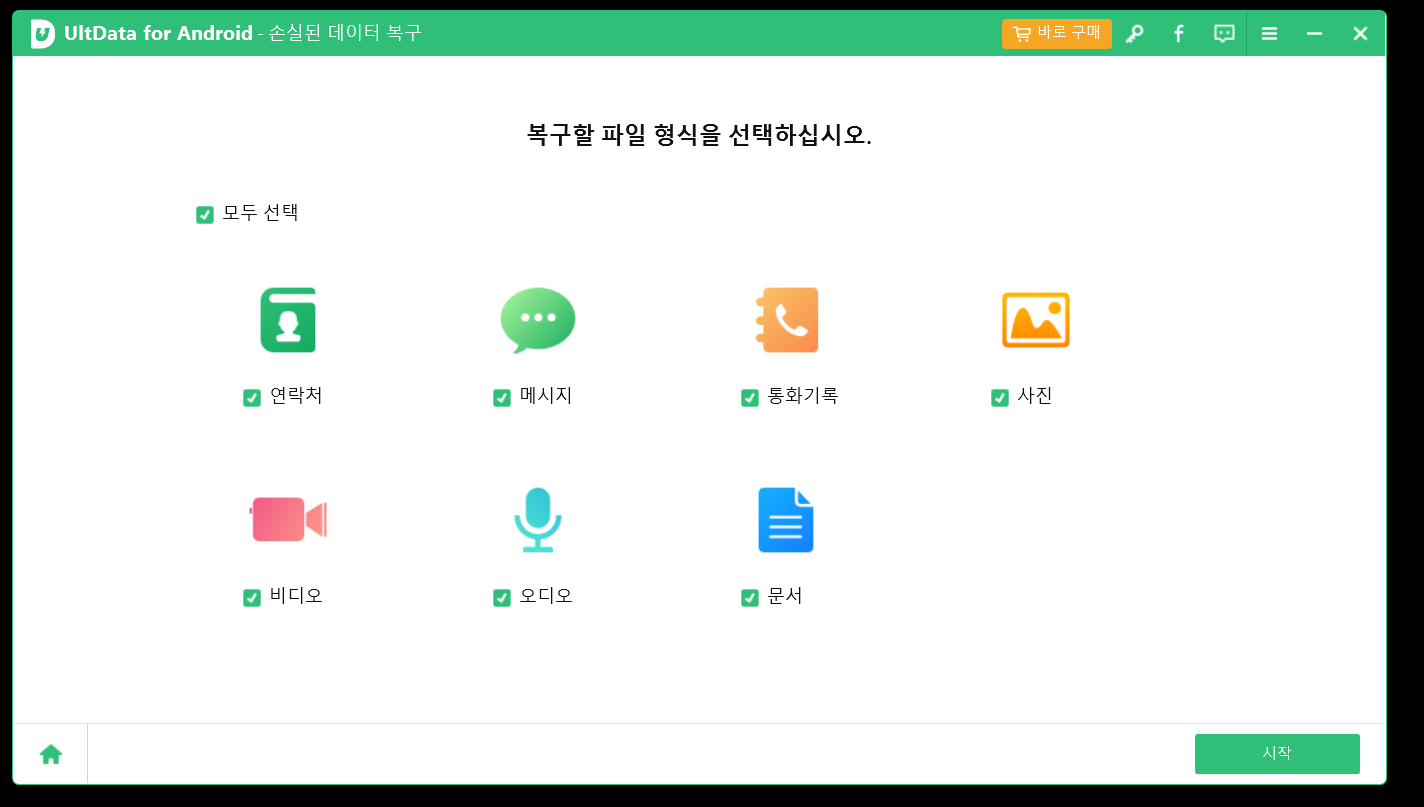 다시 PC 앱으로 돌아와서, 연결이 완료되면 스캔할 데이터 유형을 선택할 수 있습니다. 사진, 동영상, 연락처, 메시지, 통화 기록 등 다양한 옵션 중에서 본인이 복구하고 싶은 항목만 선택하면 됩니다. 전체를 다 선택할 수도 있지만, 필요한 것만 선택하면 스캔 시간을 단축할 수 있습니다.