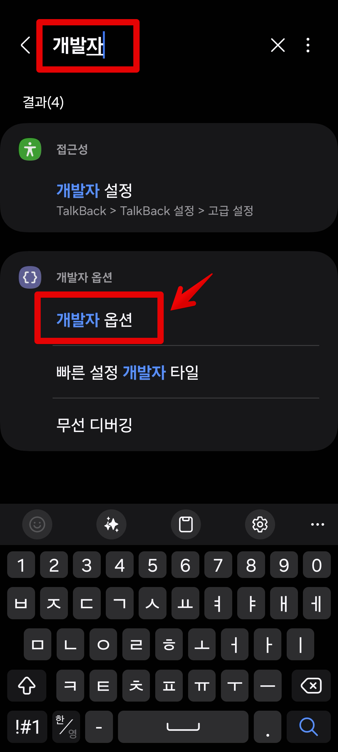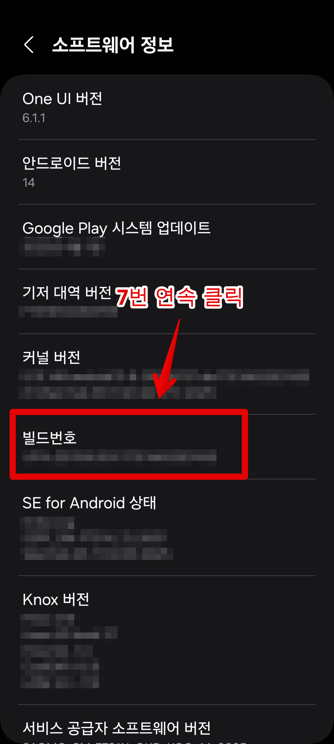 빌드번호 소프트웨어 정보가 나타나면 [빌드 번호] 쪽을 7번 연속으로 클릭해서 활성화합니다. 다음으로 위 검색창에서 '개발자'라고 검색한 후 [개발자 옵션]으로 들어간 후 활성화합니다.