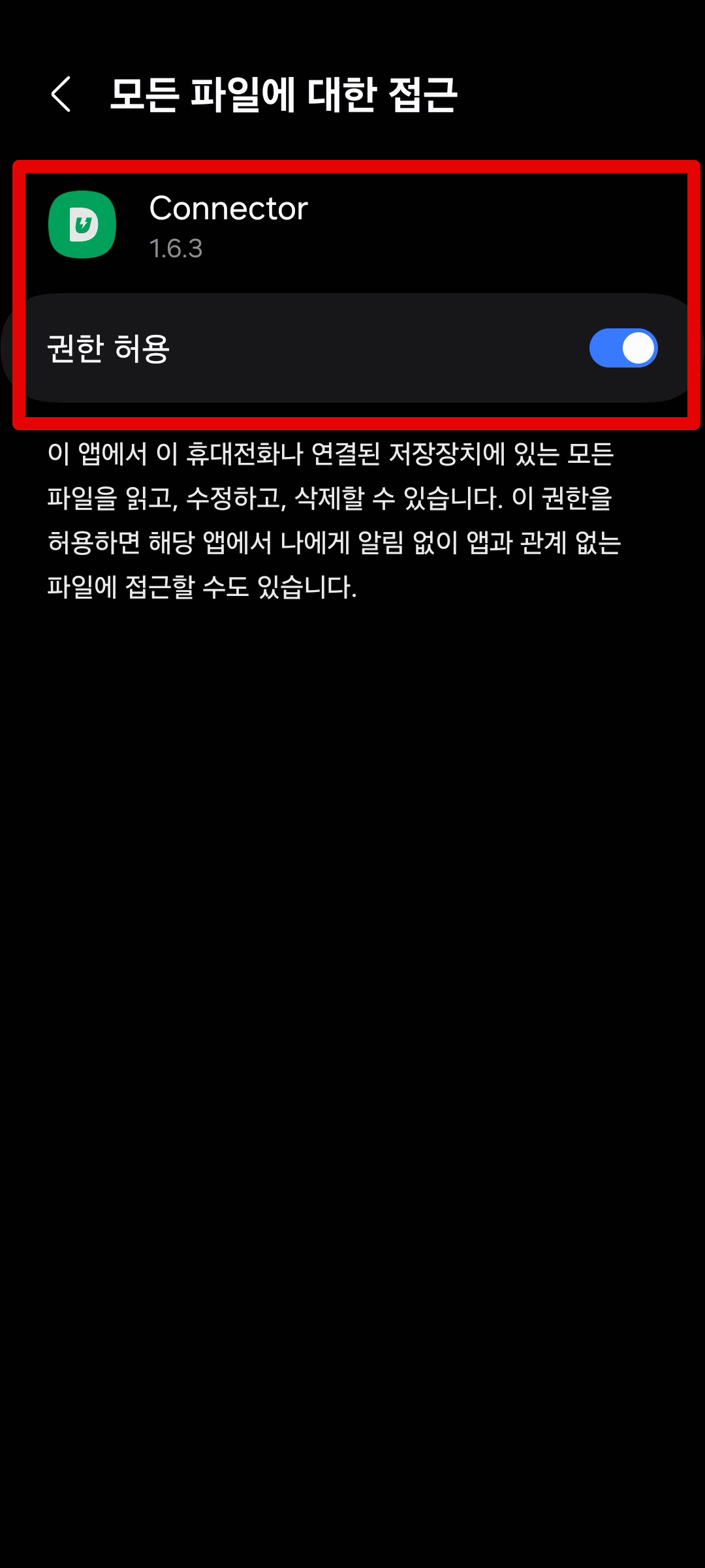 [USB 디버깅]을 함께 활성화해주고 확인 버튼을 누르세요. 다음으로 Connector에게 모든 파일에 대한 접근 허용을 권한 허용해줍니다.