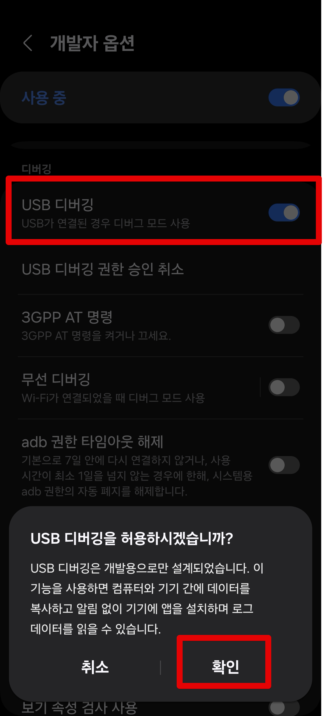 [USB 디버깅]을 함께 활성화해주고 확인 버튼을 누르세요. 다음으로 Connector에게 모든 파일에 대한 접근 허용을 권한 허용해줍니다.