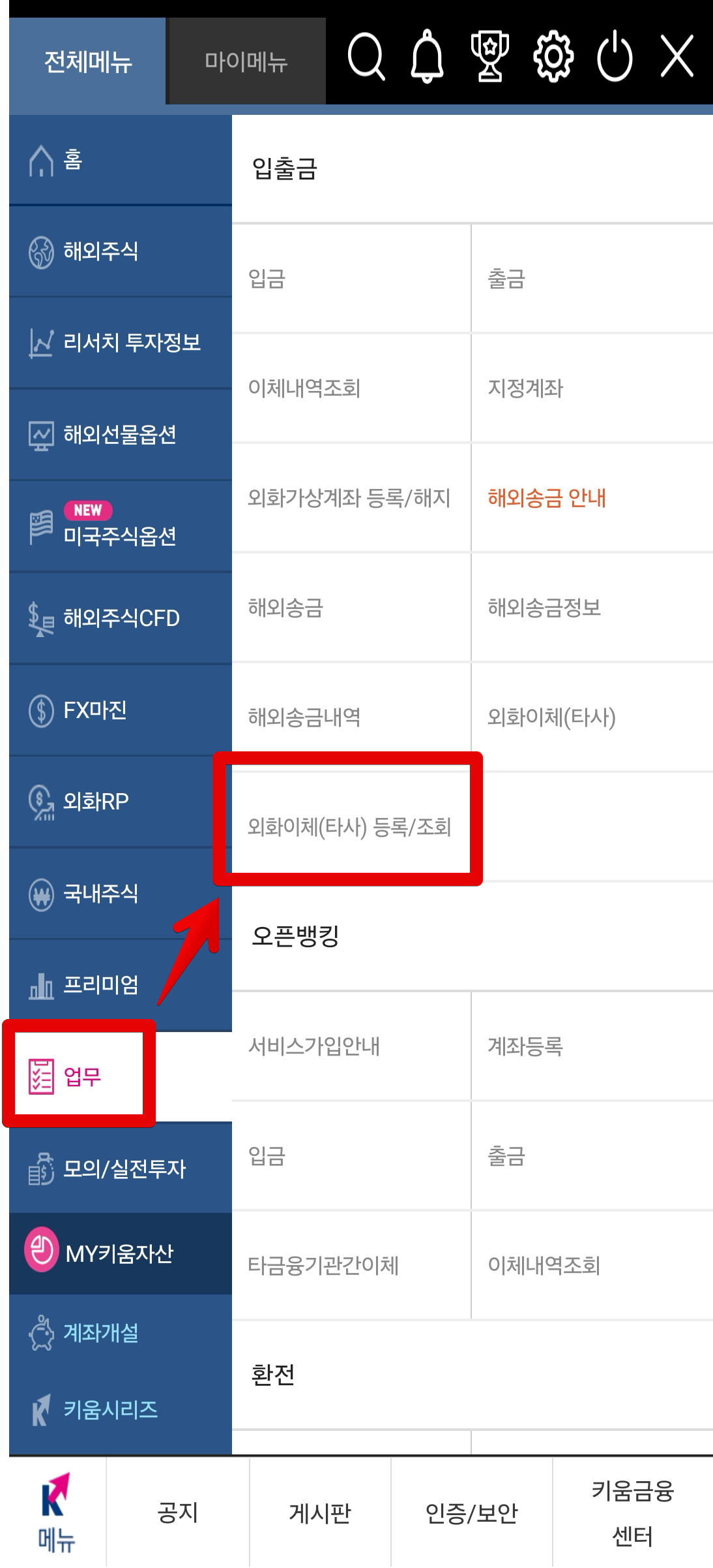 키움증권 전체 메뉴에서 [업무] - [외화이체(타사)등록/조회]에서 [외화가상계좌 등록/해지]메뉴에서 확인해주면 된다. 예전에 신청한적이 있다면 국민은행으로 된 가상계좌번호가 나타날 것이고 아닐 경우 신청해서 만들면 된다. 키움증권에서는 국민은행을 외화가상계좌 은행으로 쓰고 있다.