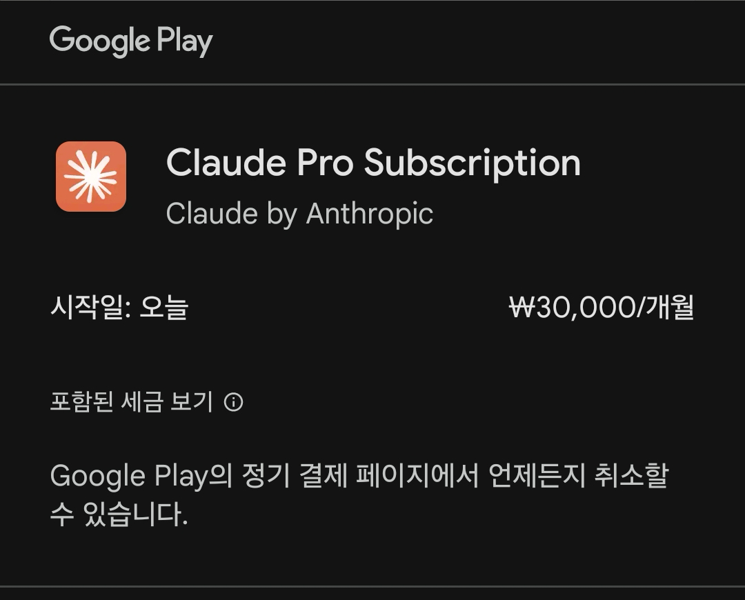 예를들어 클로드의 경우 인터넷 웹에서 결제하면 명목 금액은 $20이고 부가세를 포함하면 $22에 결제할 수 있다. 구글 플레이스토어에서 결제를 하게되면 원화로 30,000원이 찍힌다. 얼핏보면 구글플레이스토어쪽이 좀 더 비싸보인다. 하지만 환율에 따라 가격이 달라지기 때문에 계산을 해보면,