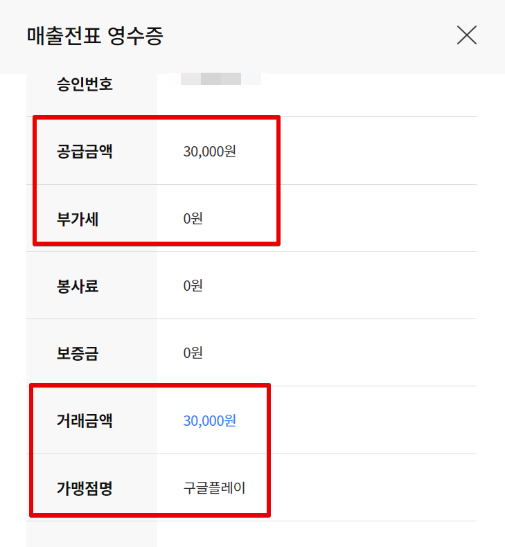 실제 카드 홈페이지에서 이용 내역을 조회해보면 공급금액만 찍혀있는걸 볼 수 있지만 거래금액과 가맹점명이 구글플레이로 나와있고 사업자번호도 볼 수 있다. 나중에 세금신고할 때 이 영수증을 매출전표 확보해서 신고하면 된다.