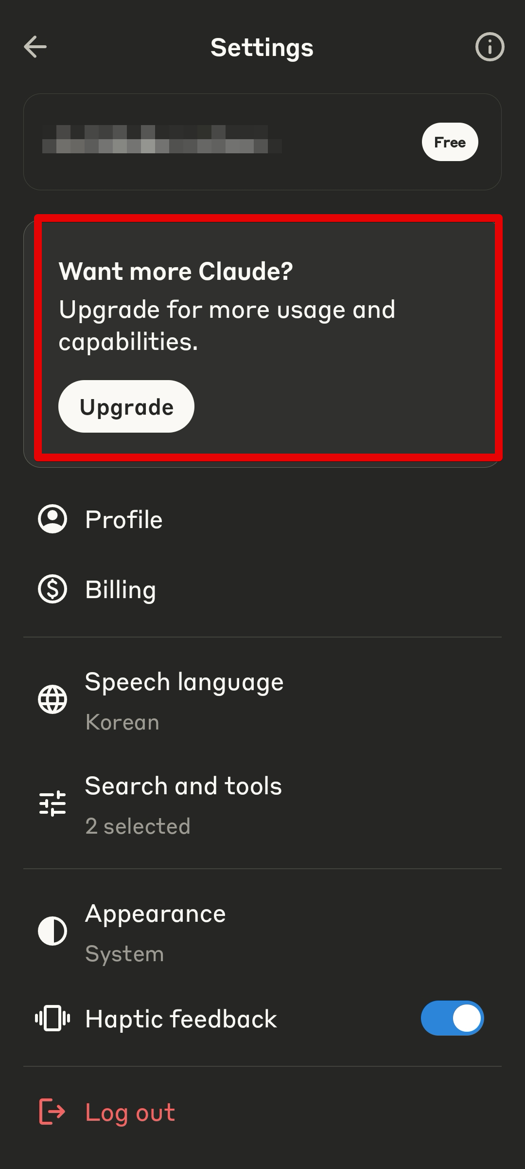 일단 클로드 앱을 깔고 PC에서 쓸 때의 계정으로 로그인을 해준다. 클로드의 경우에는 이상하게도 스마트폰 앱은 영어로만 제공된다. 웹 버전은 한글로도 잘 쓸 수 있는데... 이상하긴 하다. 암튼 업그레이드 버튼을 누르거나 빌링 버튼을 클릭해서 들어가면 된다.