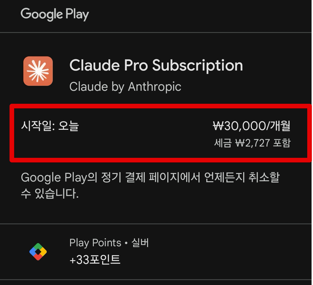 예를들어 클로드의 경우 인터넷 웹에서 결제하면 명목 금액은 $20이고 부가세를 포함하면 $22에 결제할 수 있다. 구글 플레이스토어에서 결제를 하게되면 원화로 30,000원이 찍힌다. 얼핏보면 구글플레이스토어쪽이 좀 더 비싸보인다. 하지만 환율에 따라 가격이 달라지기 때문에 계산을 해보면,