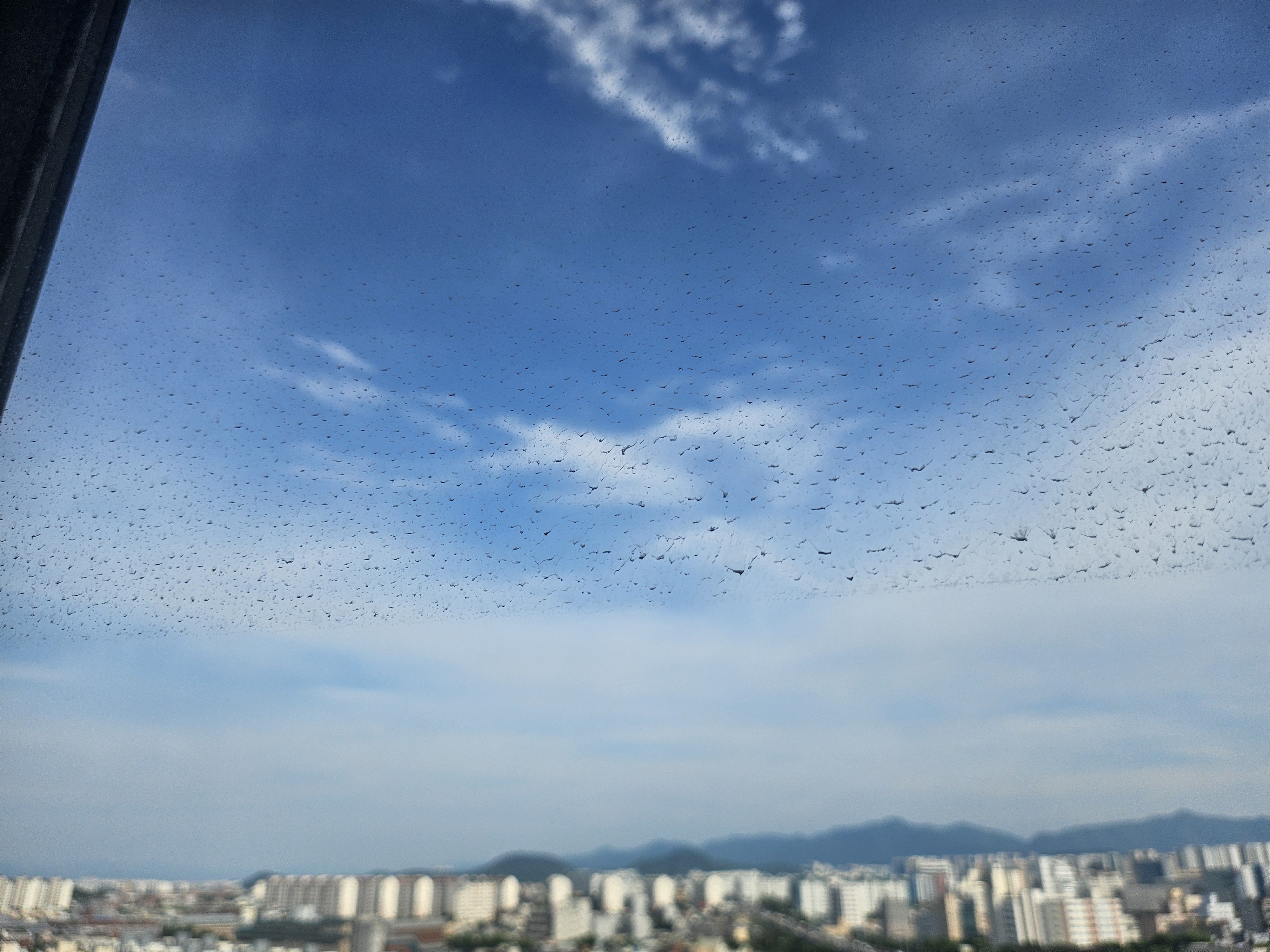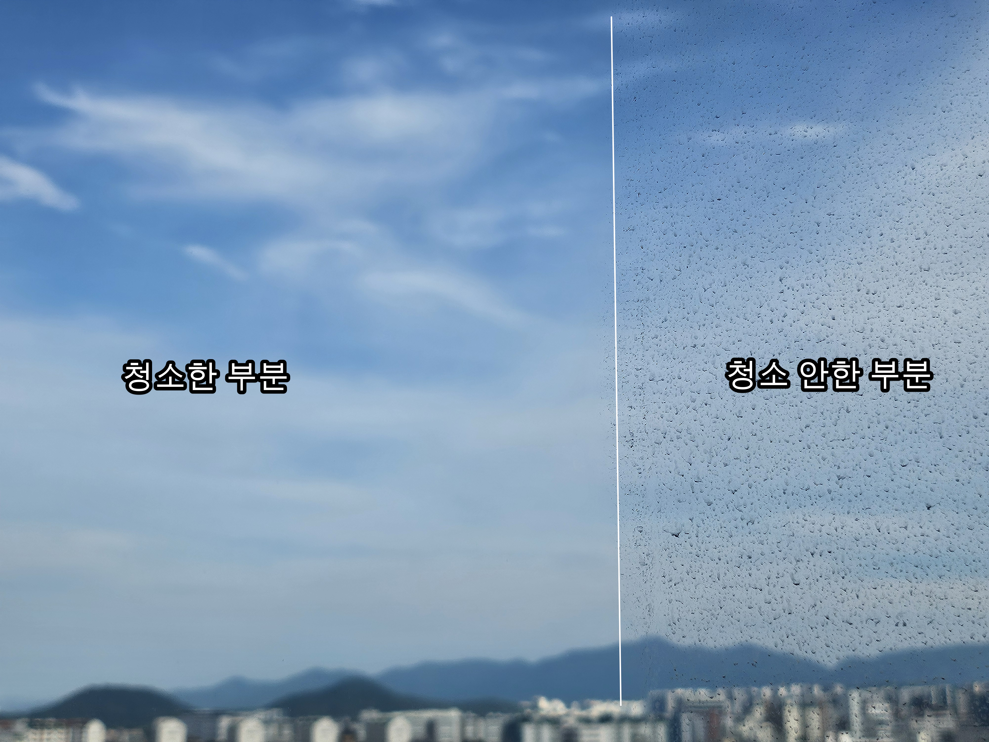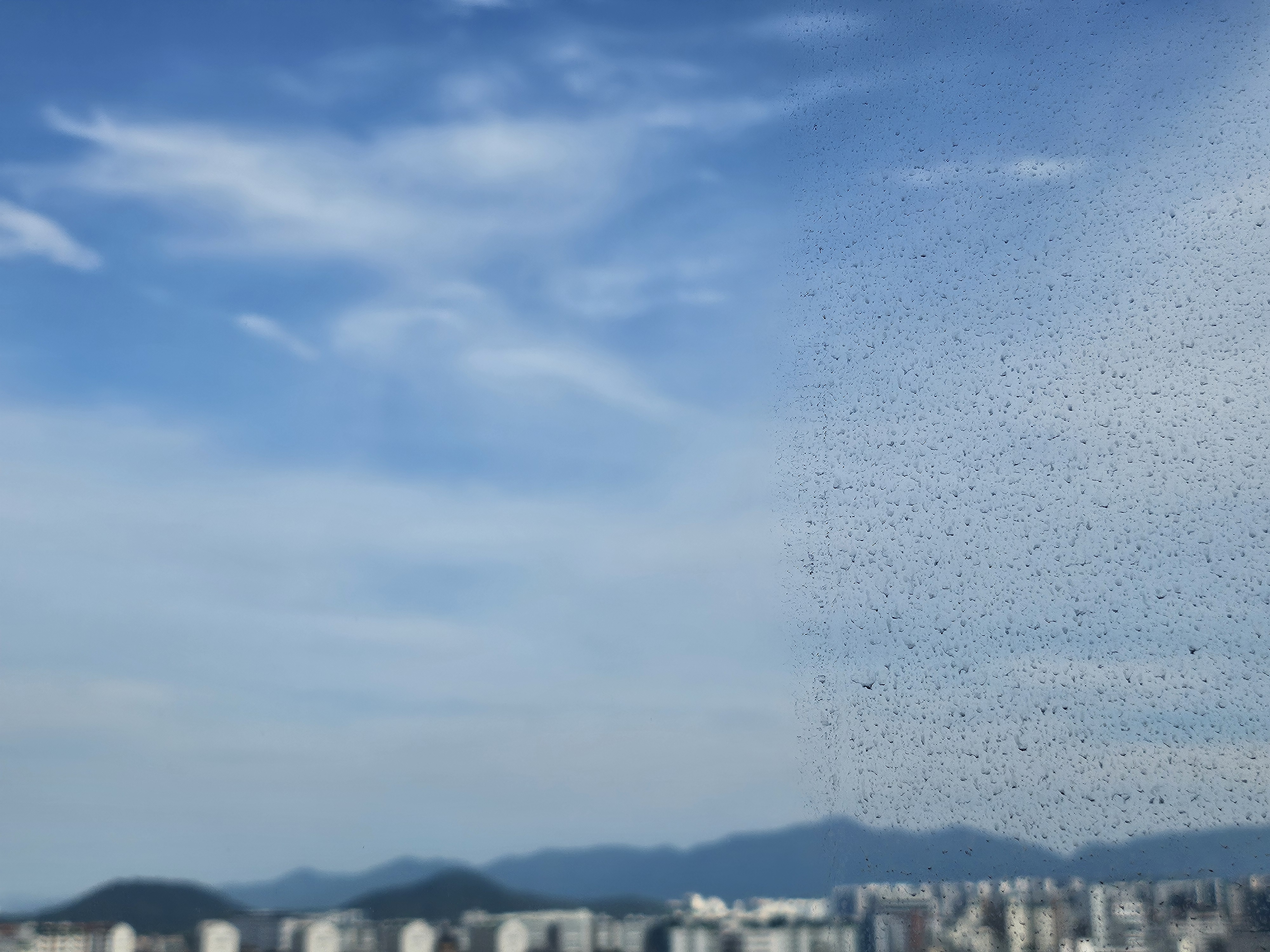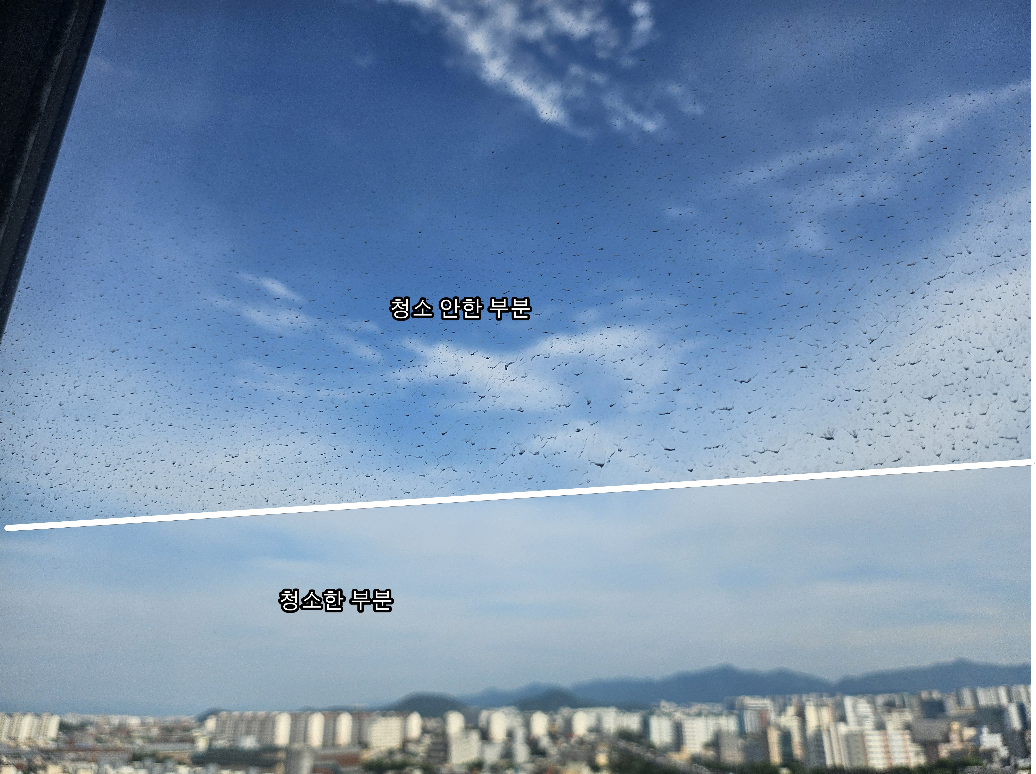 청소전 창문 외창 상태. 바깥쪽에 아무것도 없기 때문에 창문 외창 청소가 진짜 걱정이었다. 거실에서 바깥 풍경 보는걸 좋아하는 나로서는 볼 때 마다 스트레스였던 상황. 보통 비맞아서 이렇게 생긴 얼룩은 쉽게 지워지긴 하는데 청소 방법이 없어가지고, 진짜로 창문을 아예 빼버린 다음 닦은 후 다시 끼울 생각까지도 하고 있었었다.