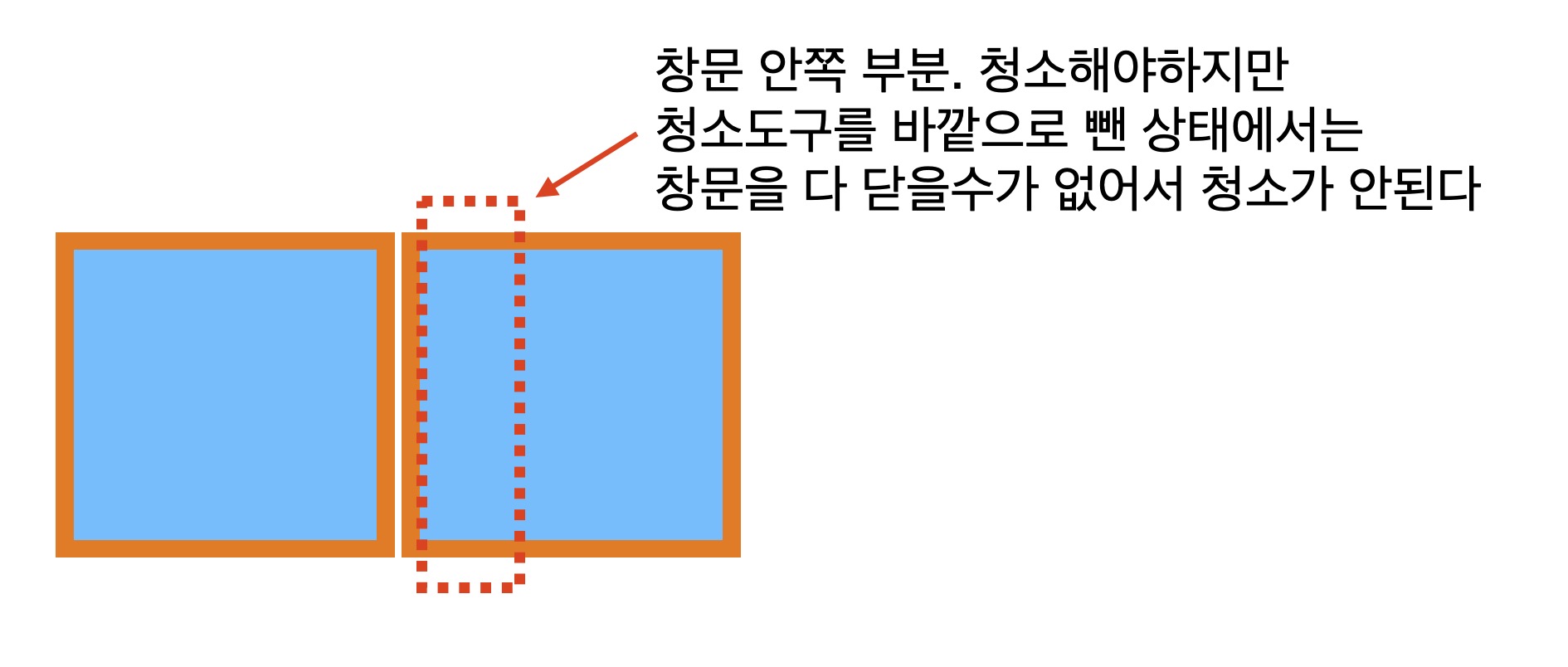 길다란 봉으로 된 청소 도구로 바깥으로 손을 빼서 청소하는 방법도 있는데 이 방법은 직접 해보니까 문제가 뭐냐하면