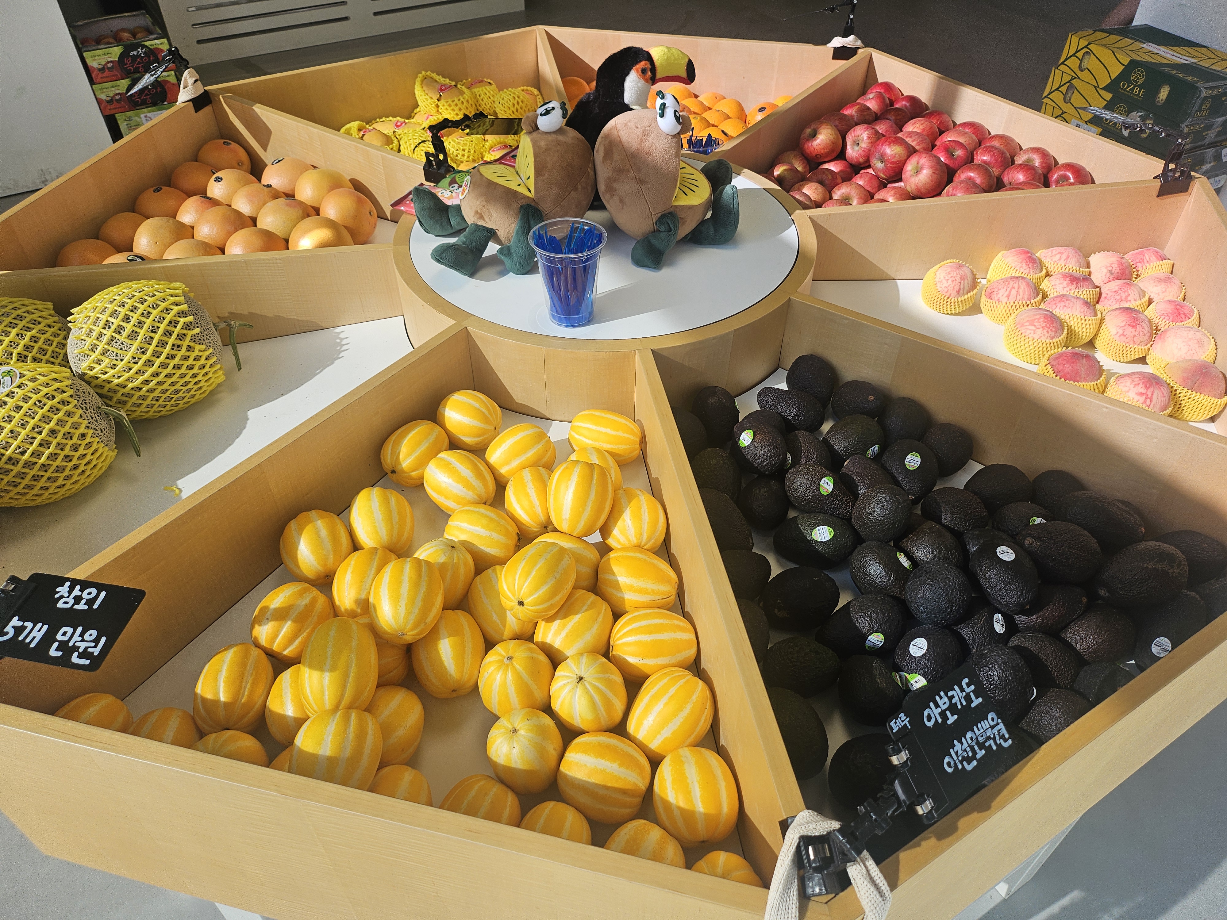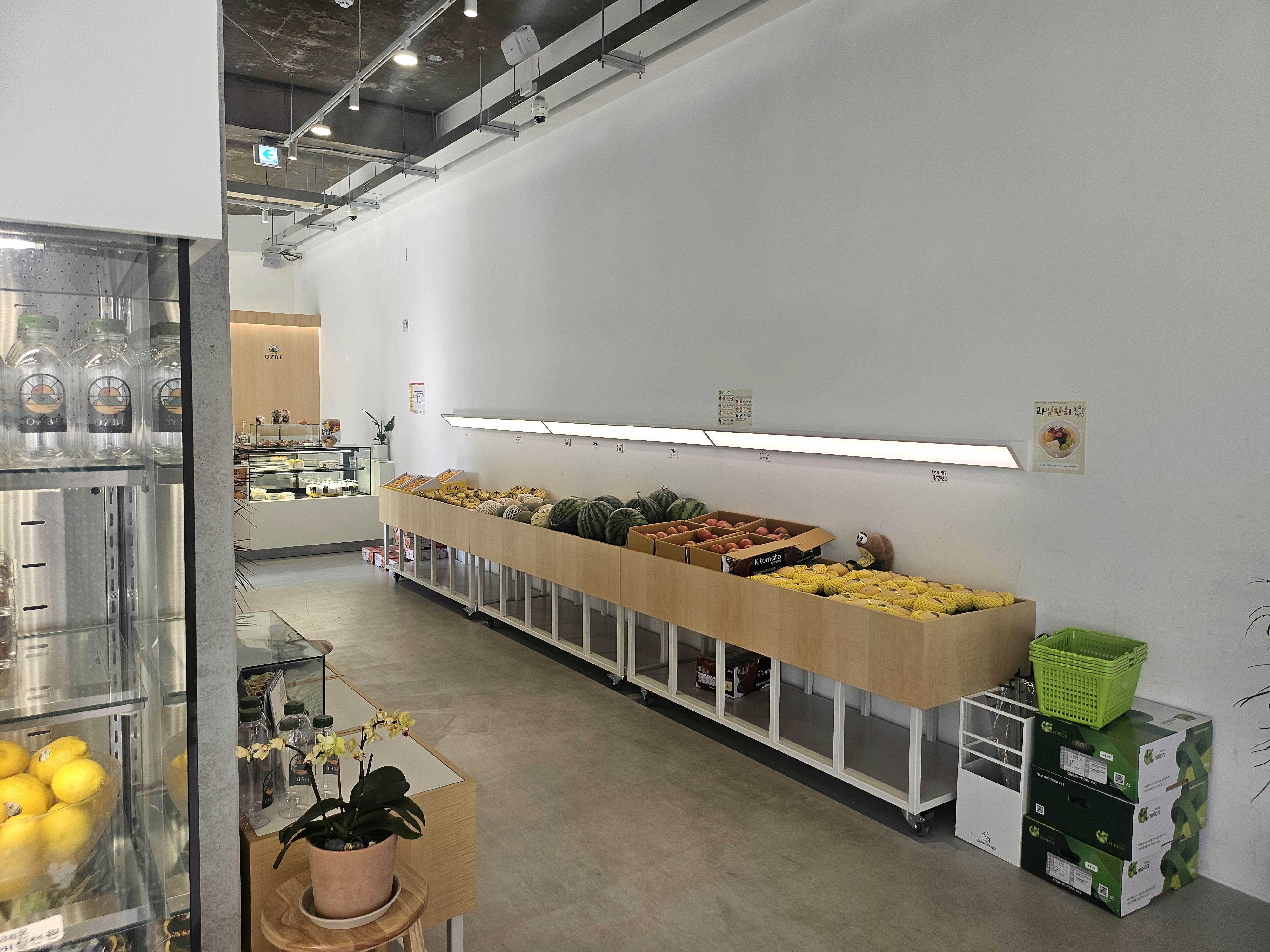 1층 공간은 카운터가 있는 곳인데 주로 과일들을 판매하는 전시코너 같은 느낌이었어요. 다양한 과일들을 볼 수 있었는데 해외에서 보던 스타일로 배치해두어서 느낌이 있었습니다. 포장해가거나 선물용으로 구매하시는 손님분들도 봤어요.