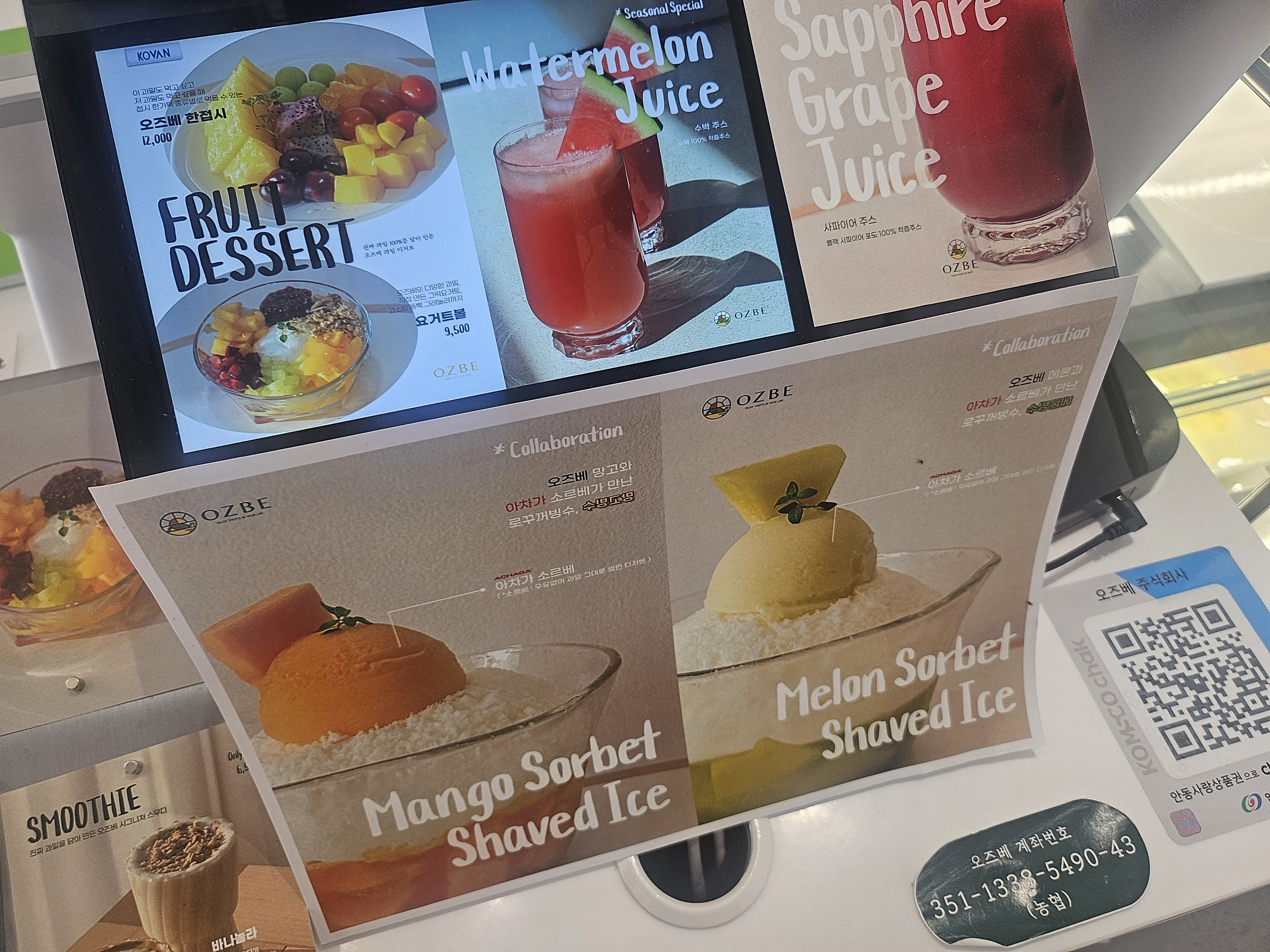 오즈베 카페 메뉴판입니다. 다양한 메뉴들이 있는데 과일카페답게 주로 과일을 활용한 메뉴들이 많은 편이었습니다.