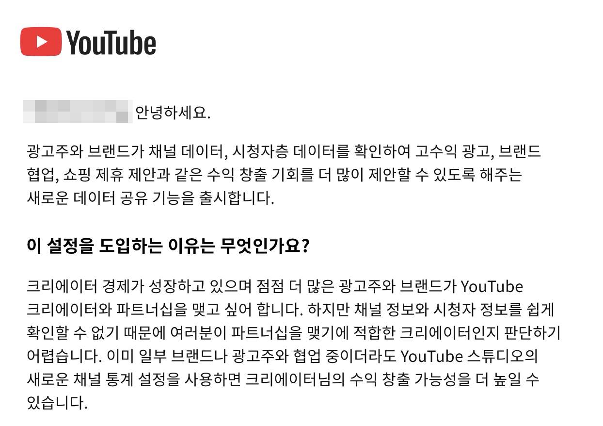 유튜브에서 채널 통계 공유 기능이라는걸 출시했다. 이 기능은 광고주와 브랜드가 채널 데이터, 시청자층 데이터를 확인할 수 있도록해서 더 많은 광고나 브랜드 협업, 쇼핑 제휴 제안과 같은 수익창출 기회를 더 많이 제안할 수 있도록 고안된 기능이다.