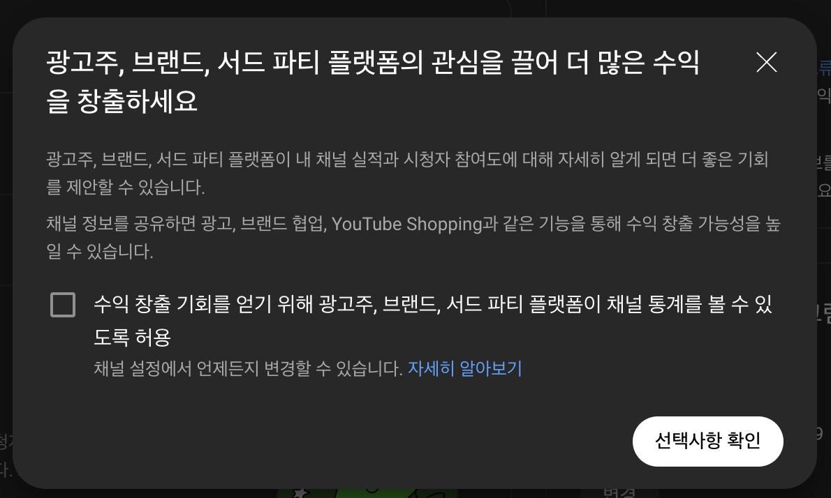 해당 기능을 사용할 수 있게 된 이후에 유튜브 스튜디오에 접속하게 되면 위와 같이 광고주, 브랜드, 서드 파티 플랫폼의 관심을 끌어 더 많은 수익을 창출하세요라는 메시지가 나타나고 아래쪽에 허용하는 체크 버튼이 있다.