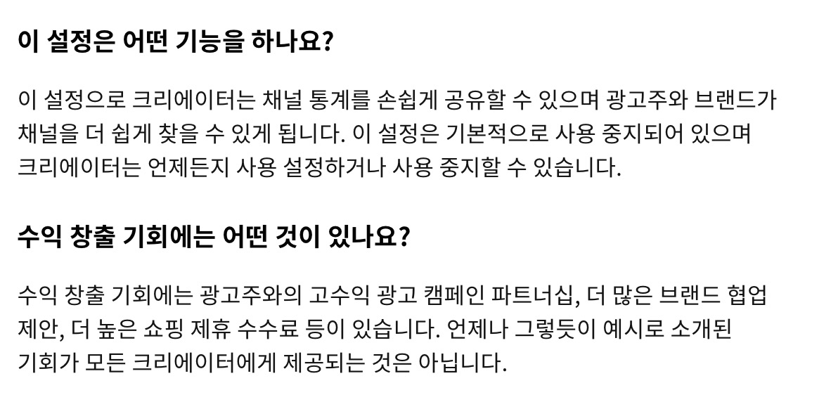 유튜브 스튜디오 설정에서 손쉽게 해당 기능을 온/오프 할 수 있다. 이 설정을 켜게 되면 다양한 광고주들에게 자신의 유튜브 채널에 대한 자세한 통계가 공식적으로 공개되고 제공될 수 있다.