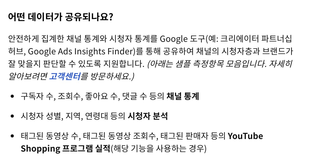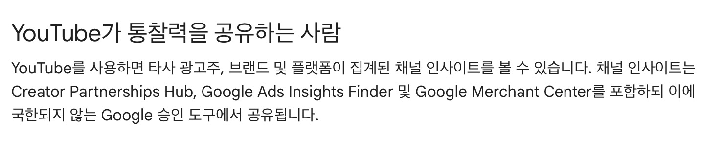 채널의 인사이트는 크리에이터 파트너십 허브, 구글 광고 인사이트 파인더, 구글 머천트 센터에 포함되고 이외에도 구글 파트너십 승인 도구 등 다양한 환경에서 광고주들에게 통계를 제공할 수 있다.